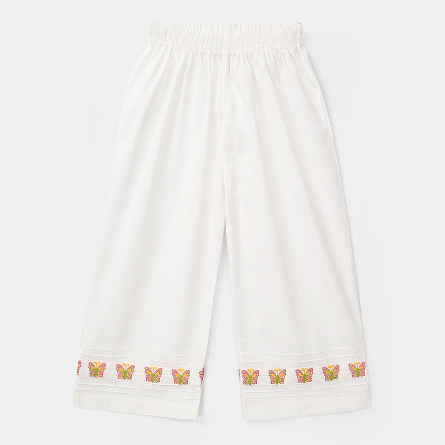 Girls cotton embroidered culottes in white feature a loose cut with butterfly embroidery on the hem.