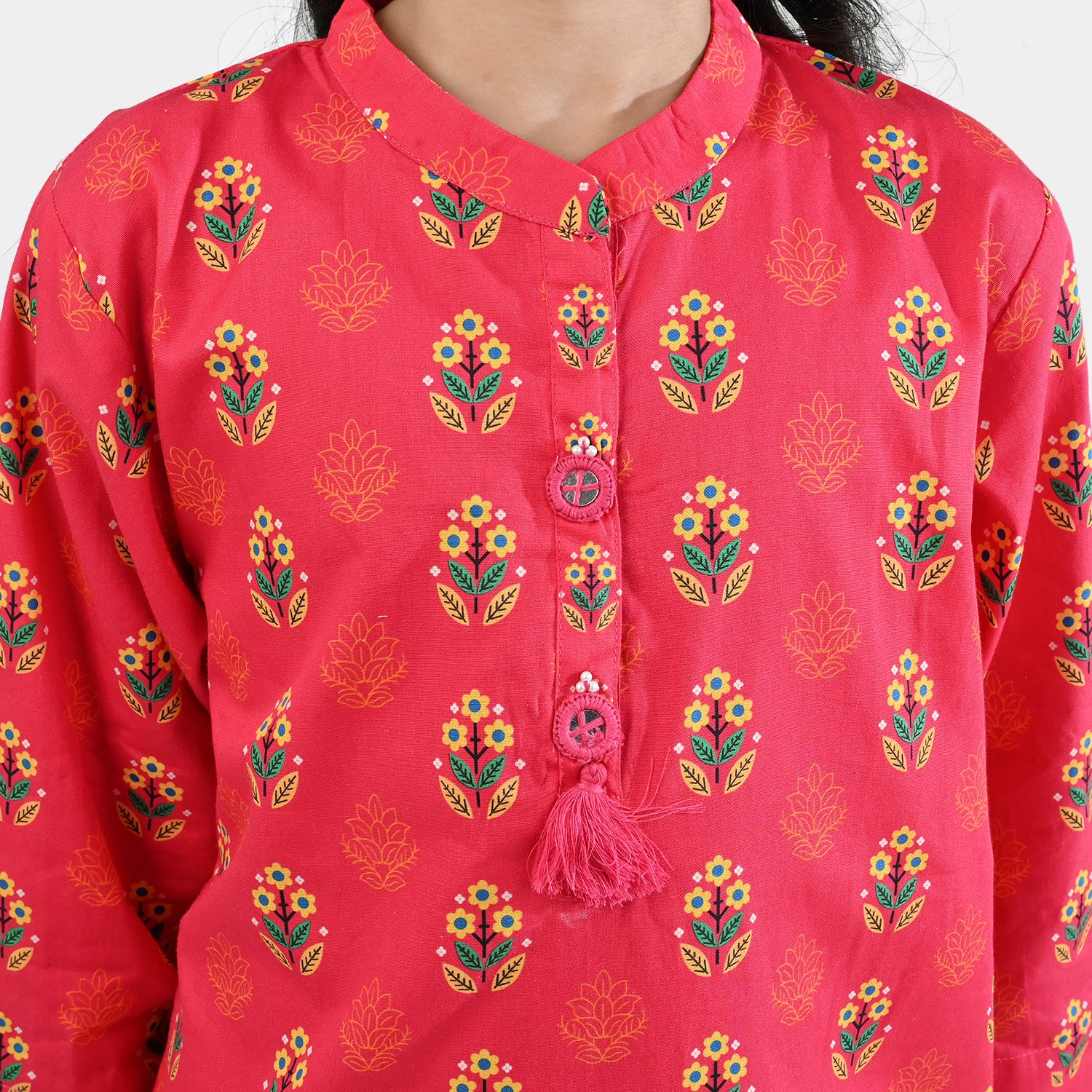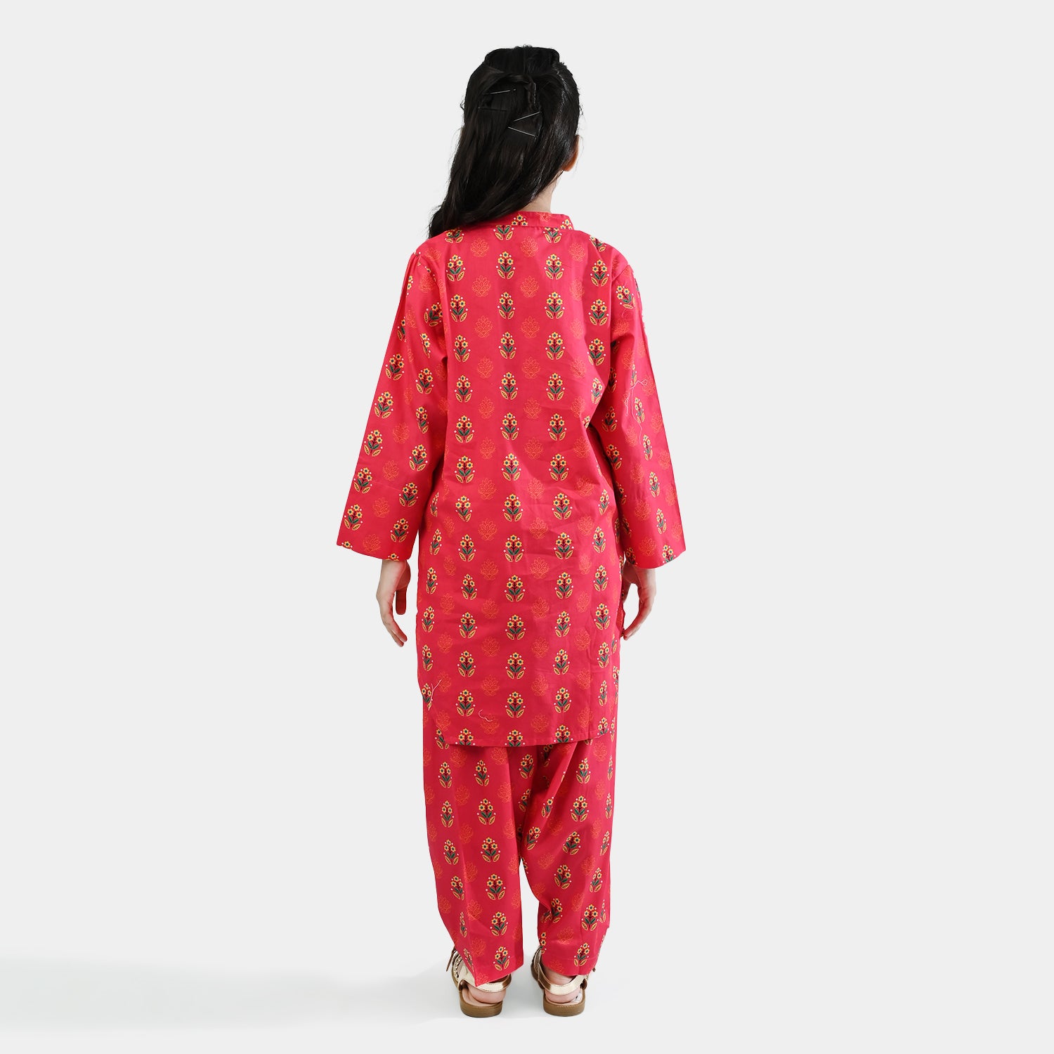 This red printed cotton poplin kameez and shalwar set features a shirwani collar, button detailing on neckline, and full sleeves, offering a classic and elegant look.