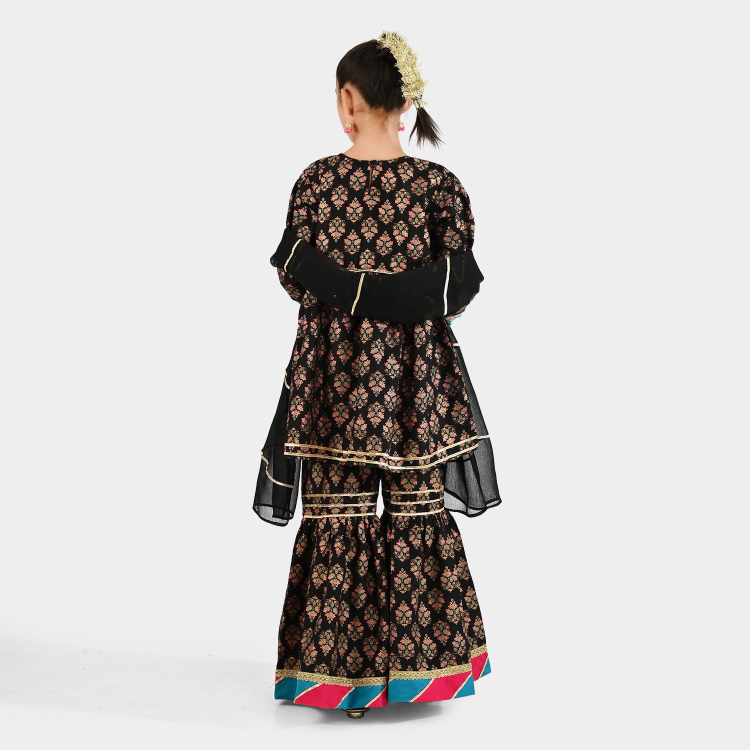 Black raw silk 3-piece printed set featuring a short frock, matching gharara, and plain dupatta for a complete and graceful traditional look.