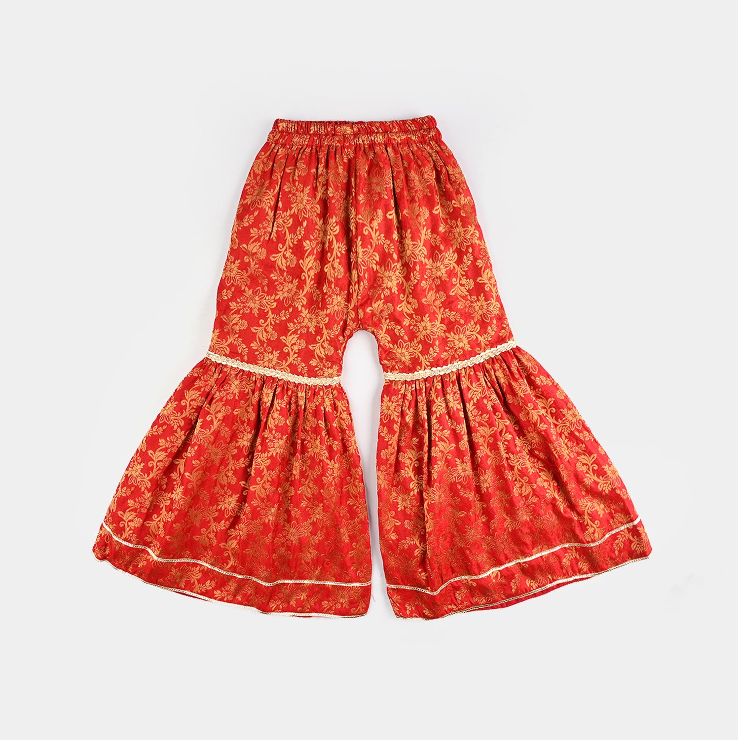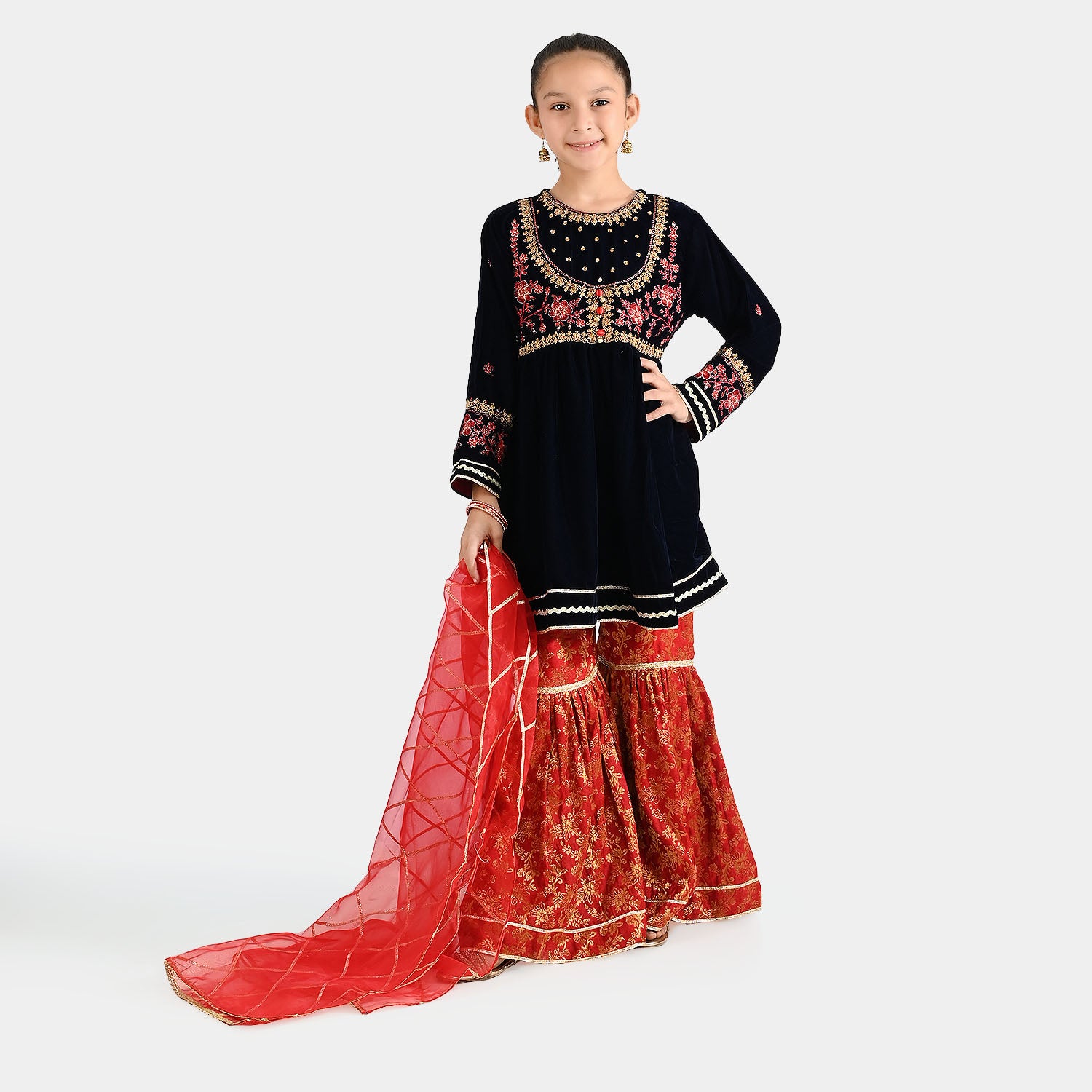 This Girls Velvet 3Pcs set features intricate embroidery and contrasting gharara pants, creating a traditional look perfect for special occasions. The dupatta adds a stylish finishing touch. Designed for comfort and elegance, it's ideal for your child’s festive events.
