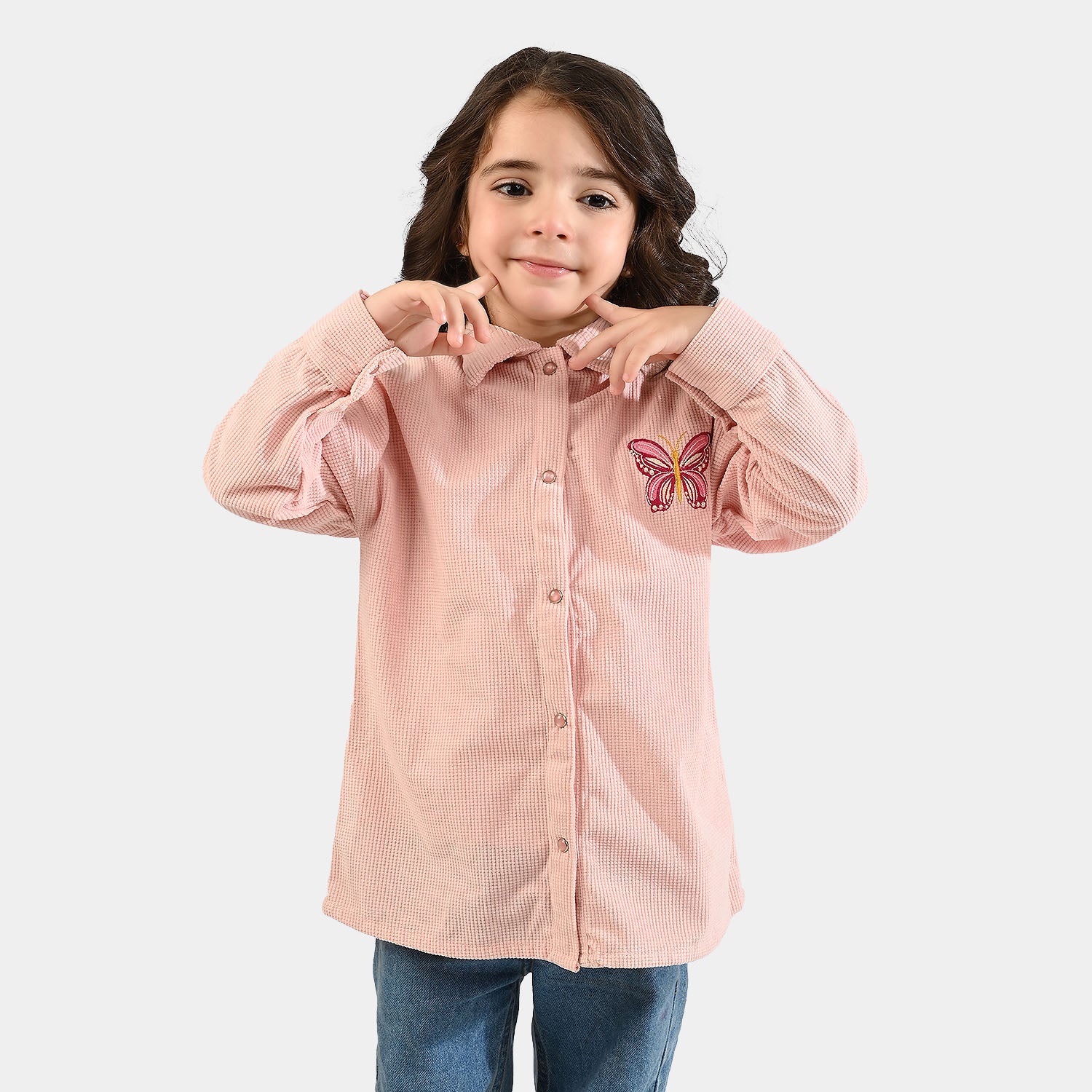 This pink girl's top features a crinkled polyester fabric adorned with butterfly embroidery. It is designed as a front-open long shirt, complete with full sleeves and a collar for a perfect look.