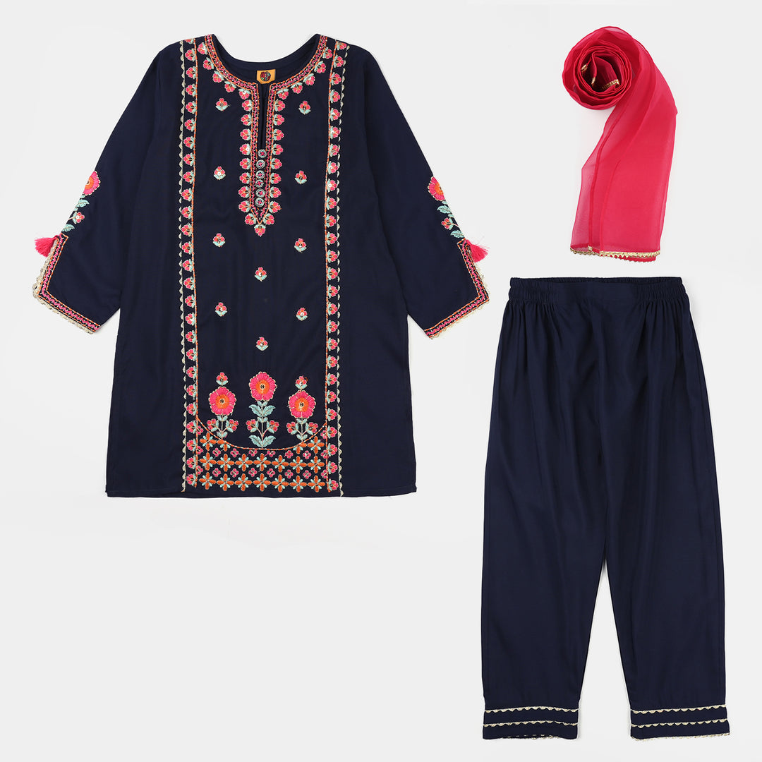 Girls Cotton Slub Embroidered 2Pcs - Navy Blue