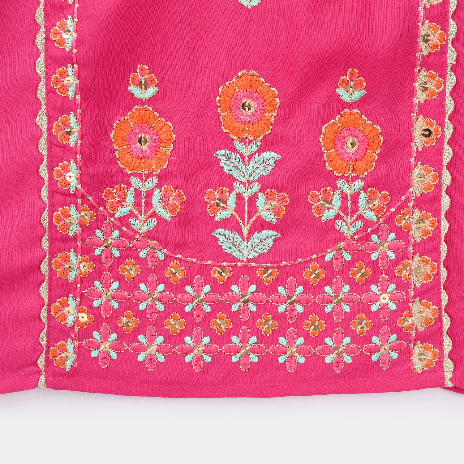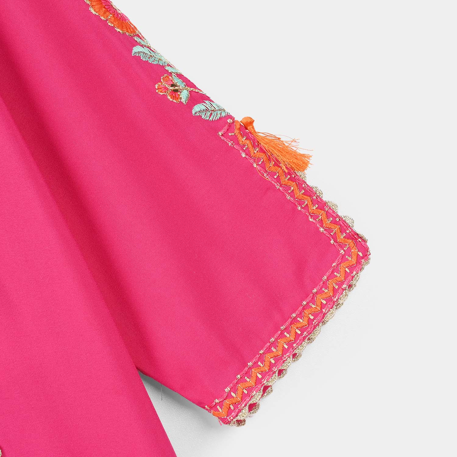 This pink girls' embroidered poly cambric 3-piece set features full sleeves with tassel detailing, straight-fit bottoms, and a contrasting orange dupatta for a stylish traditional look.