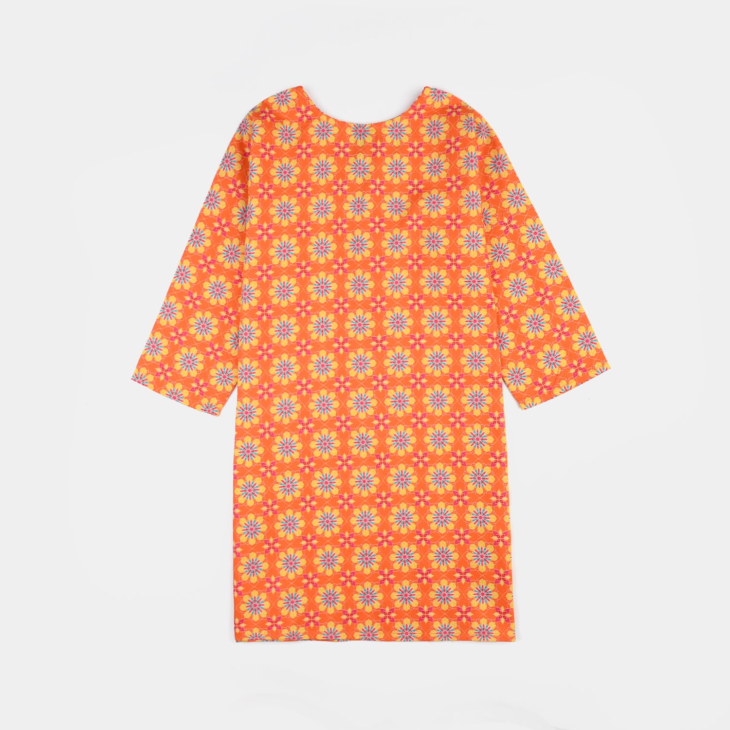 Girls orange 2-piece set featuring a printed shirt with a round neck, tassel detailing, and full sleeves, paired with matching straight-fit trousers for a complete traditional look.