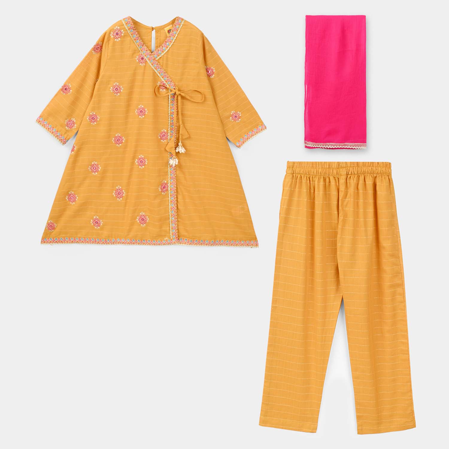 Girls’ dobby 3-piece set in mustard, featuring an anarkha-style embroidered shirt with dori detailing, full sleeves, matching bottoms, and a contrast pink dupatta. Perfect for festive and traditional occasions.