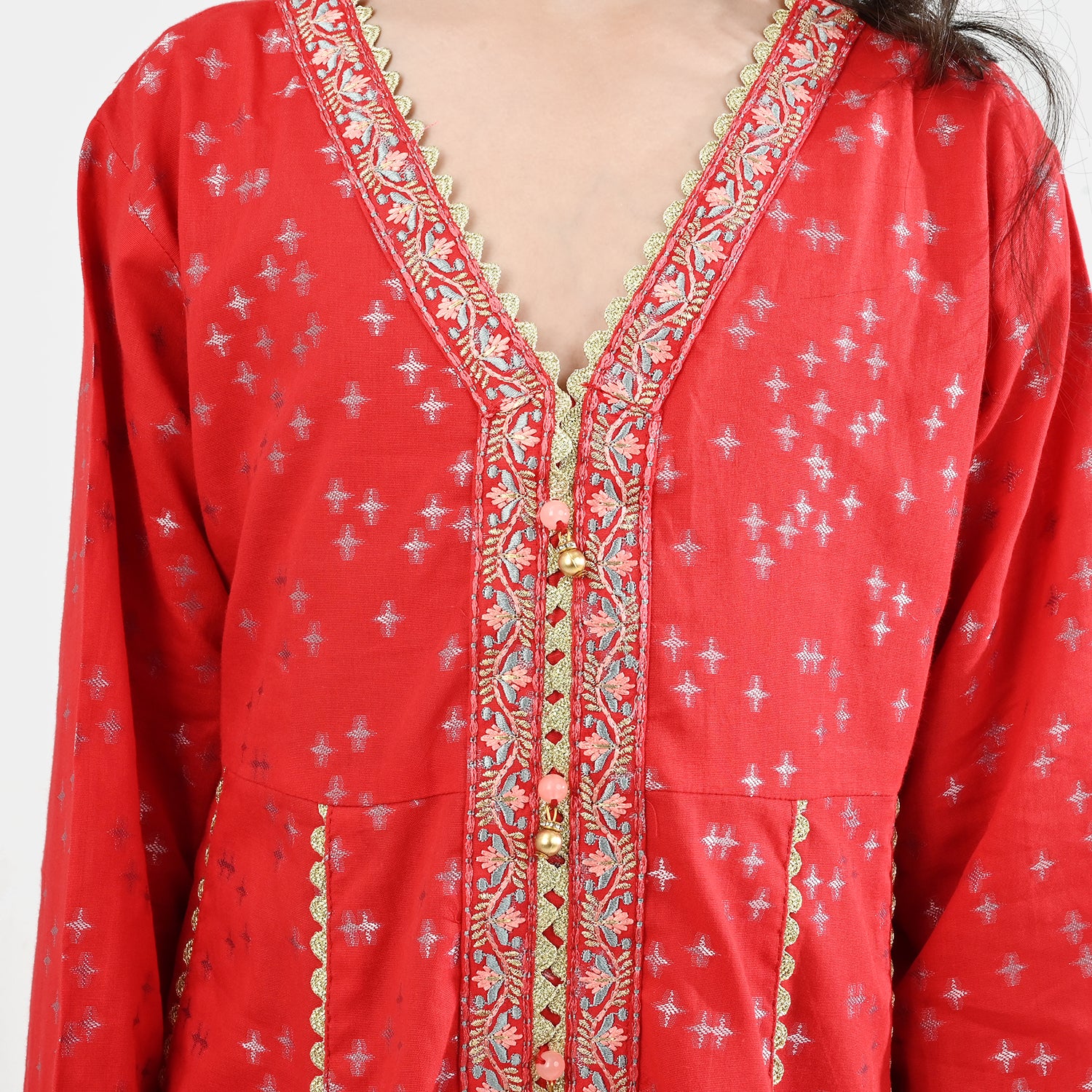 Red printed jacquard shirt featuring a V-neck with a center opening and lace detailing, styled with full sleeves and matching trousers with lace accents for an effortless daily or occasional look.