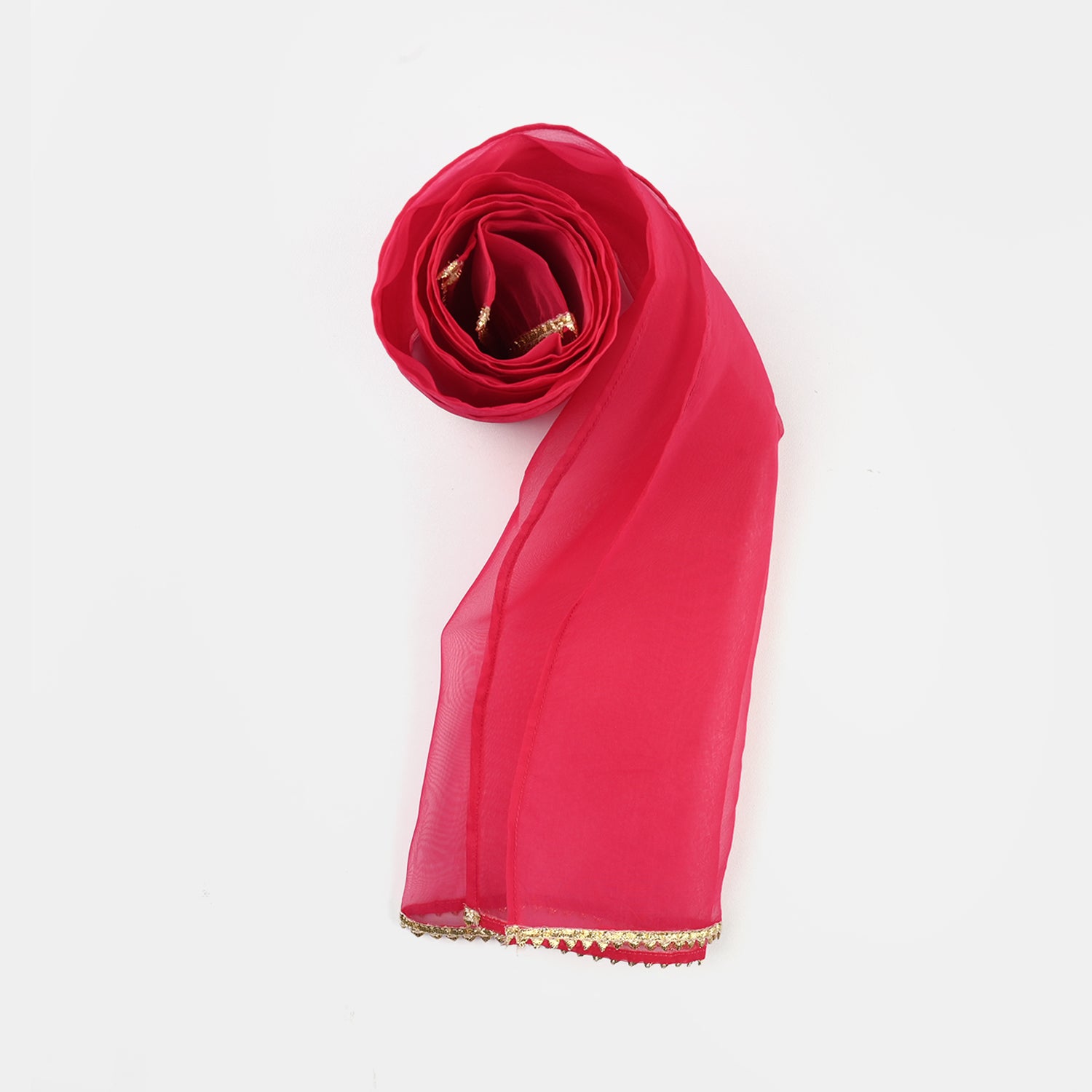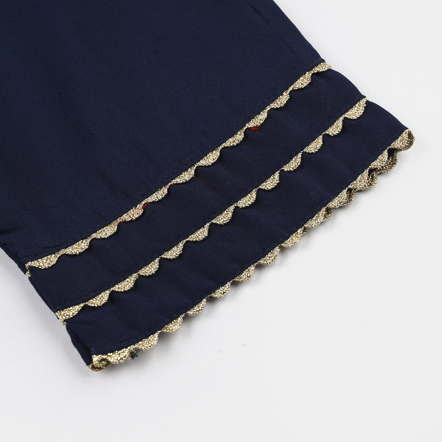 This navy blue girls embroidered poly cambric 3-piece set features full sleeves with tassel detailing, straight-fit bottoms, and a contrasting pink dupatta for a stylish traditional look.