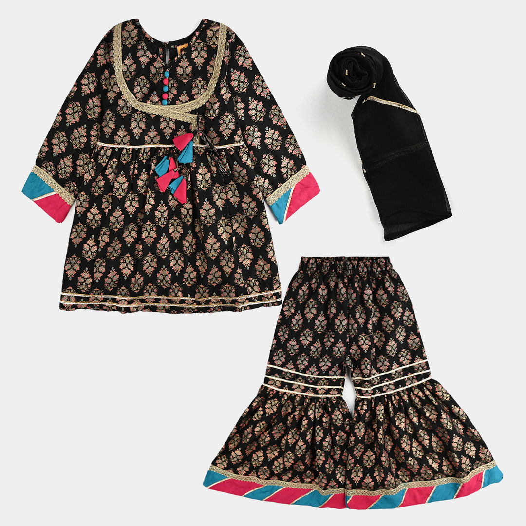 Girls Cotton Poplin EMB 2 Pcs Suit Flora-BLACK