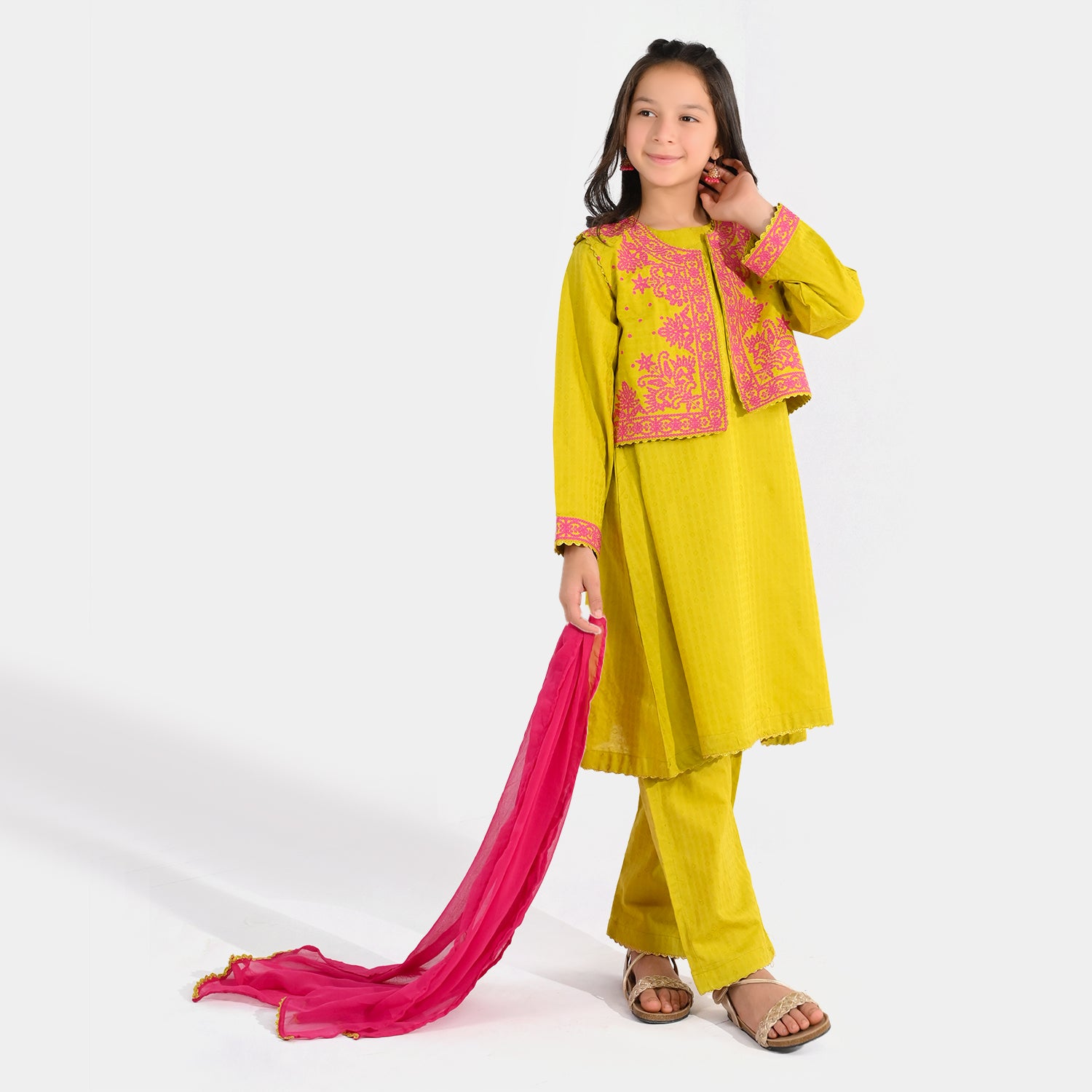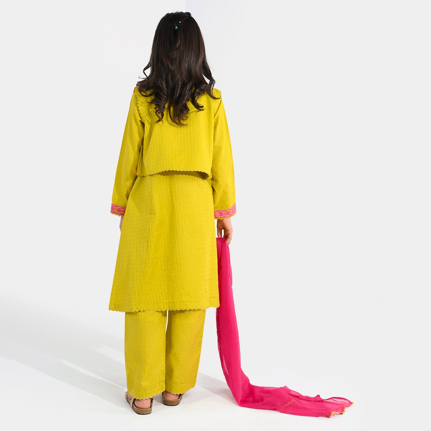 Girls' olive jacquard 3-piece suit featuring a full-sleeve embroidered top with matching bottoms and a contrasting dupatta, perfect for a stylish and festive everyday look.