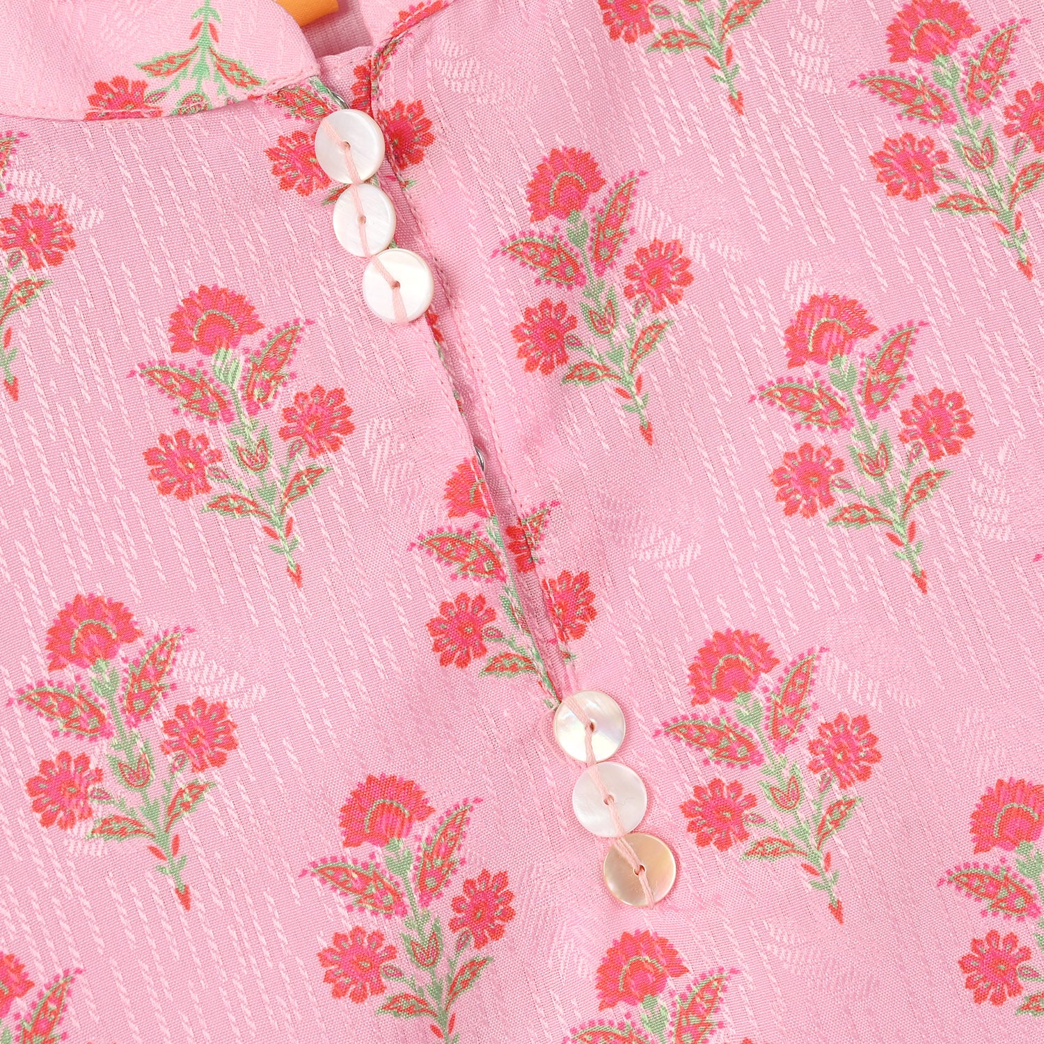 Girls’ jacquard printed 2-piece set in pink featuring a collared top with button detailing on the neckline, full sleeves, and matching bottoms, perfect for a stylish and comfortable everyday look.