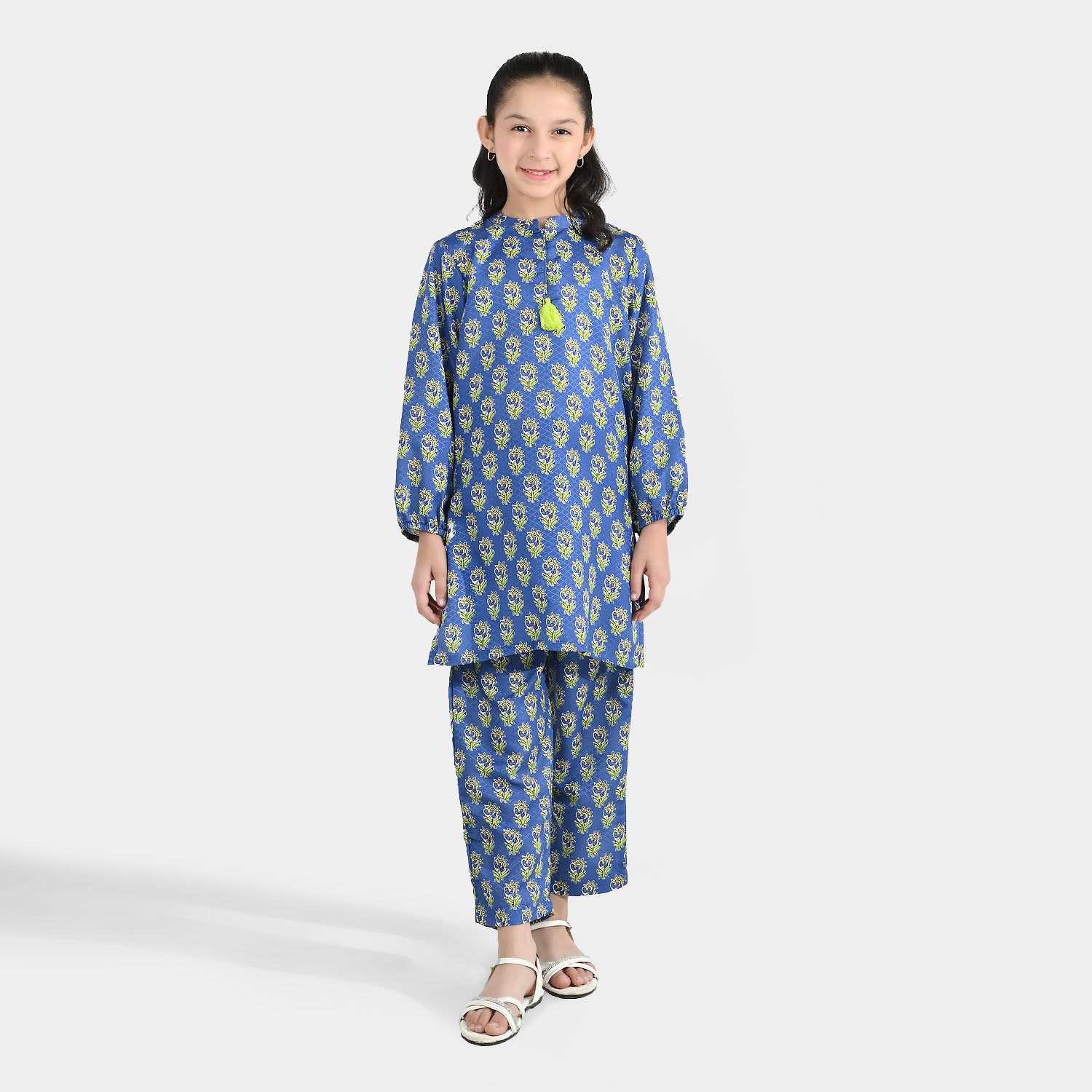 Girls' blue jacquard 2-piece set featuring a round-neck top with full sleeves, a teal floral print, and matching bottoms, perfect for a stylish and comfortable everyday look.