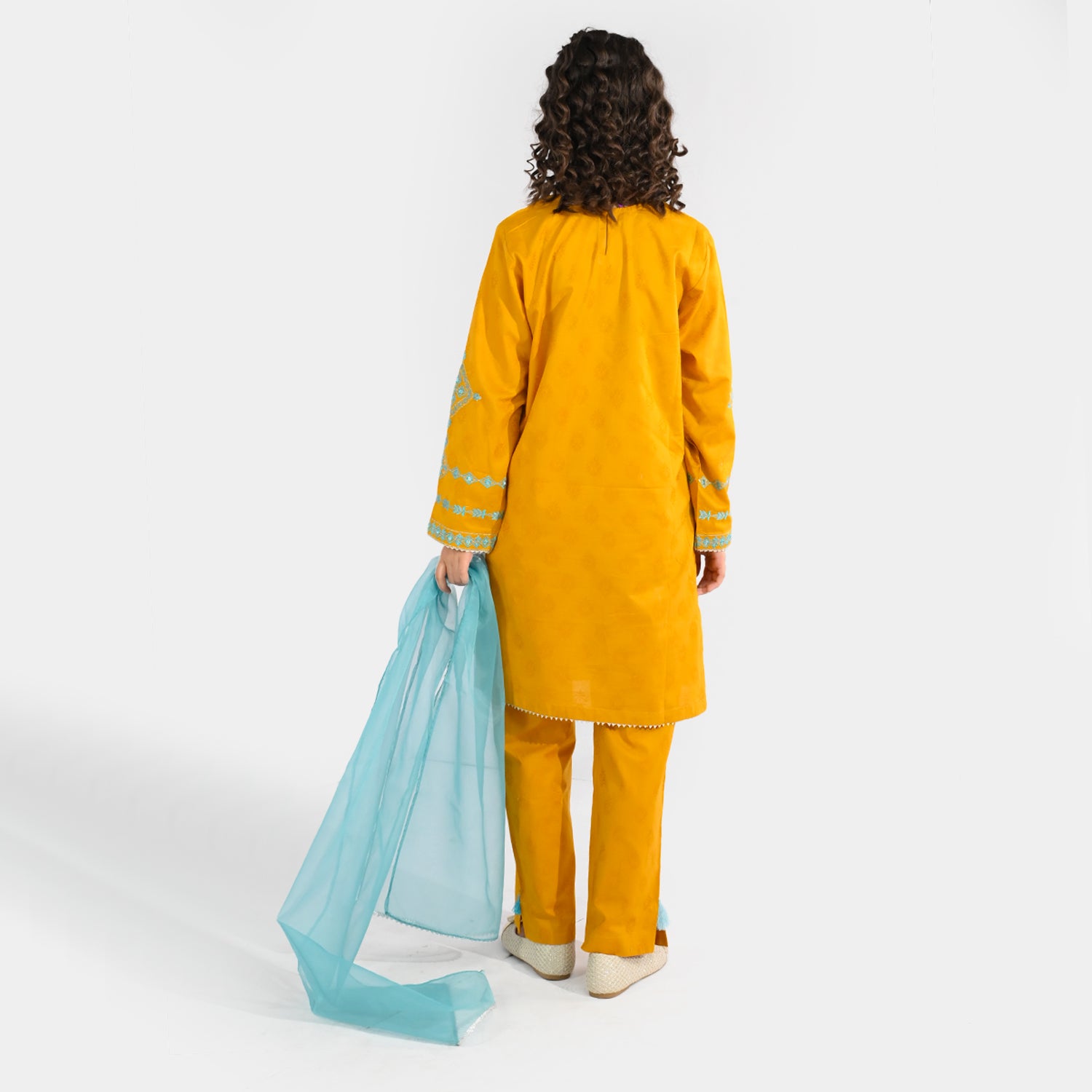 Girls' mustard 3-piece set features a round-neck, straight-fit embroidered shirt with full sleeves, matching trousers with slit and tassel detailing, and a contrasting blue dupatta, perfect for festive or special occasions.