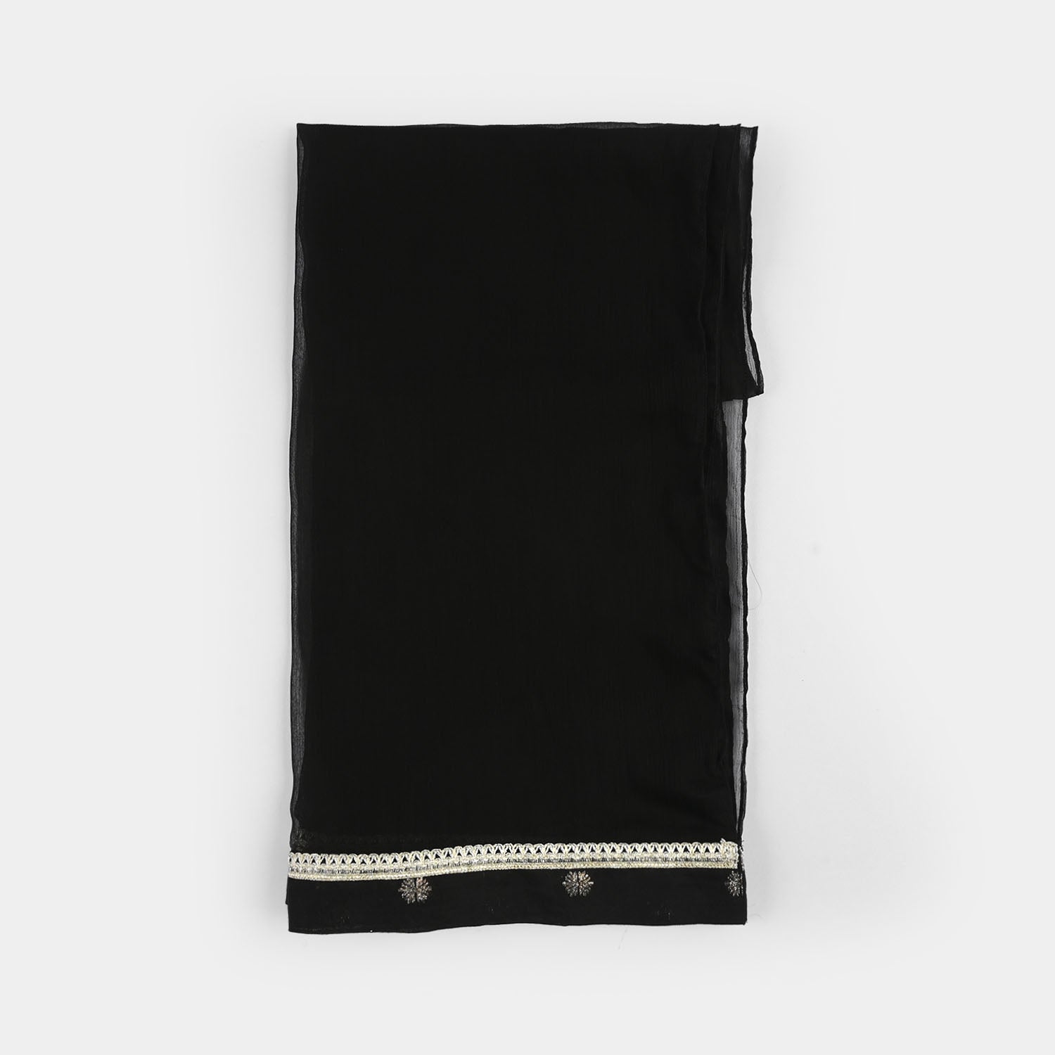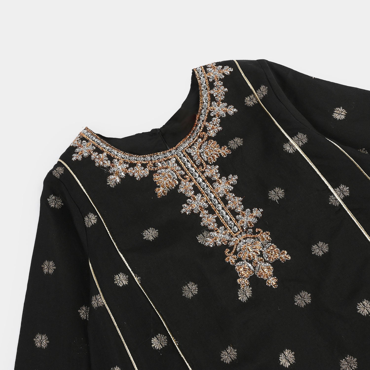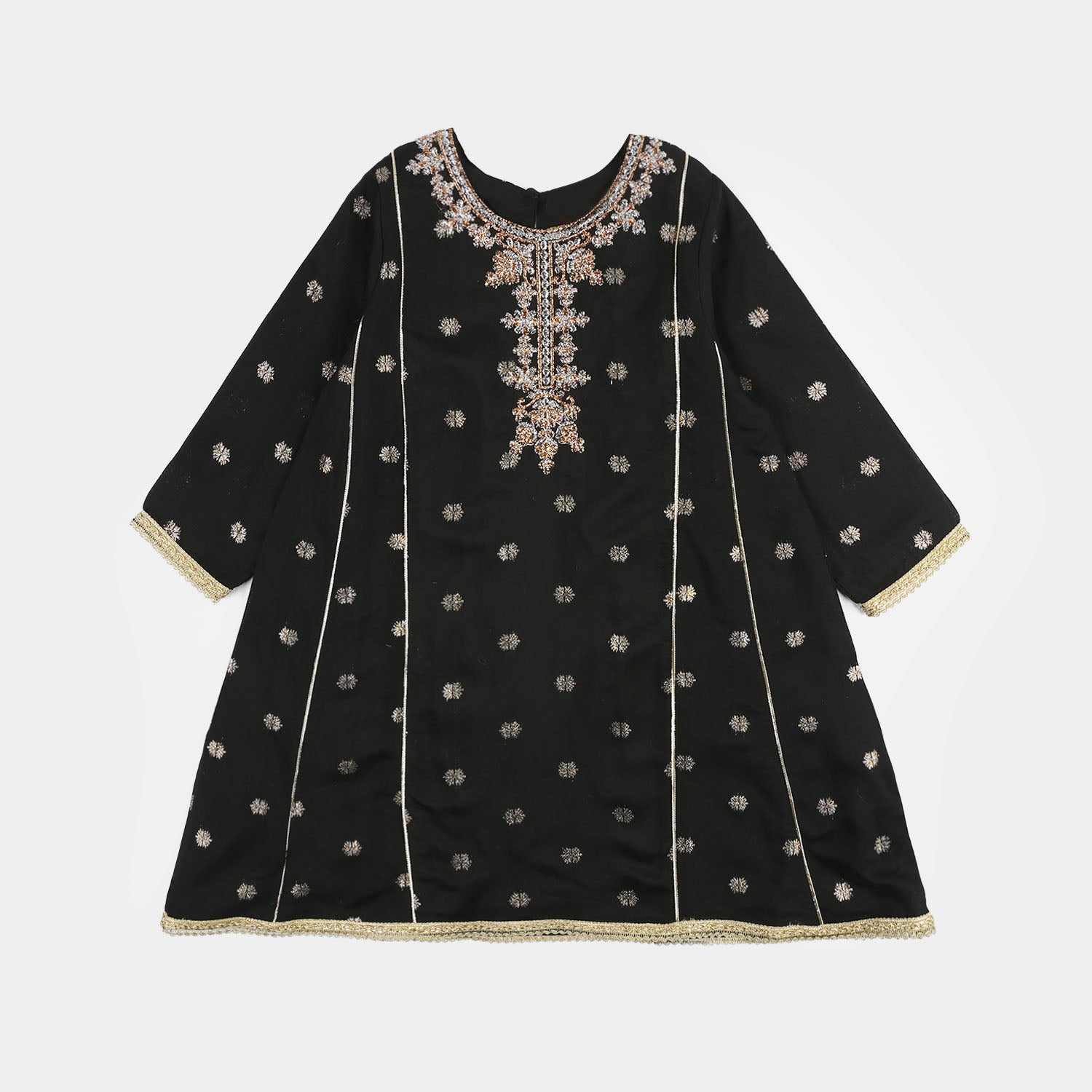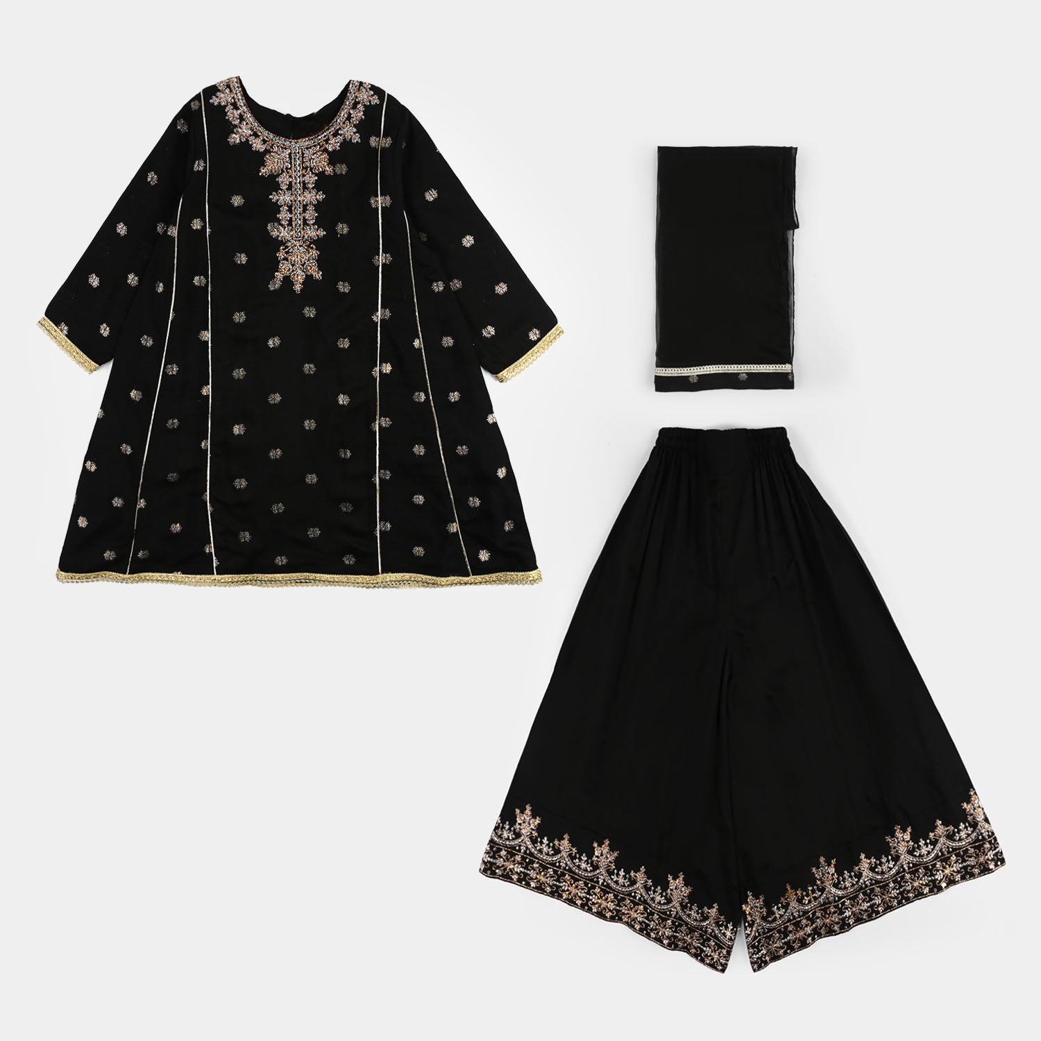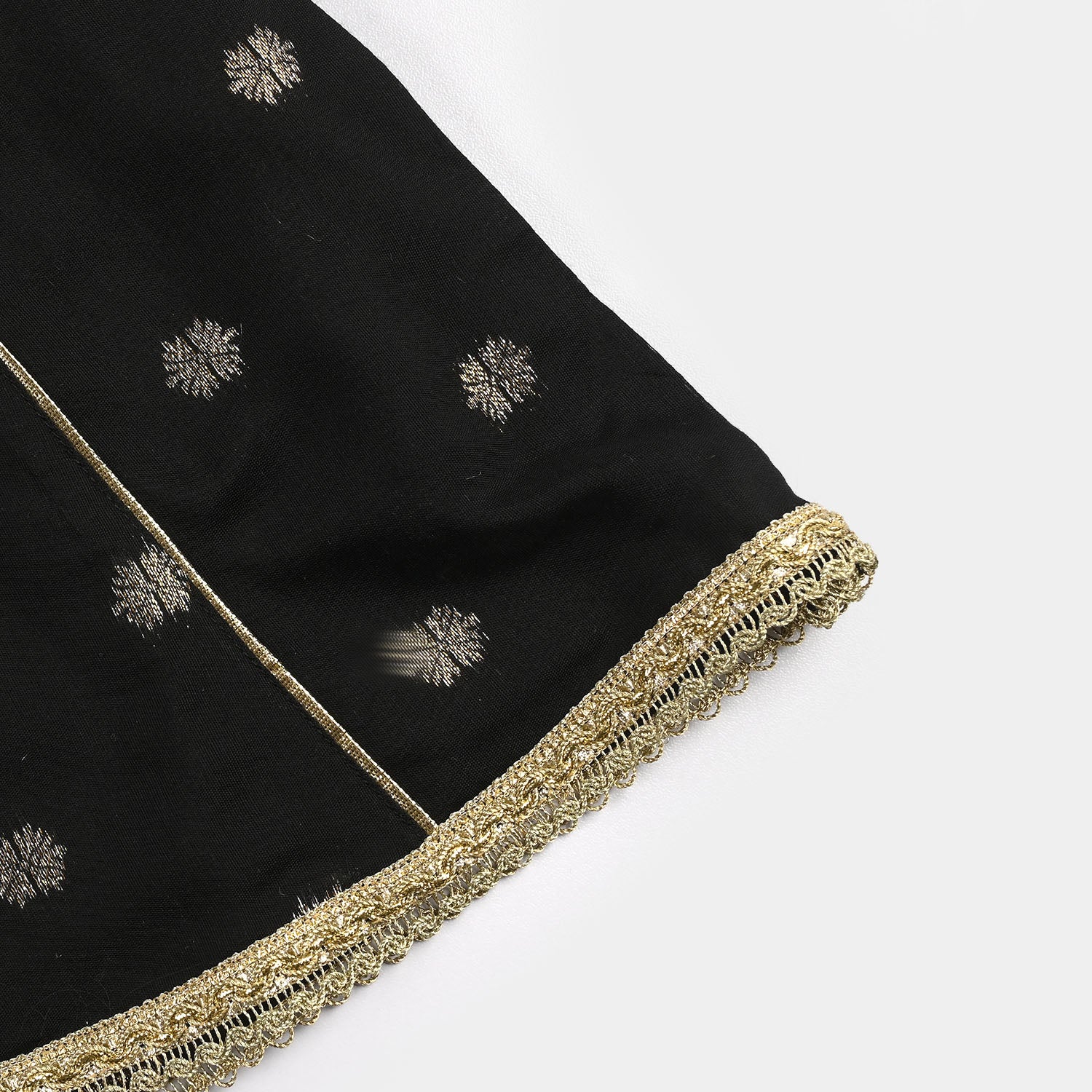 Girls' black jacquard 3-piece set featuring a round-neck, full-sleeve kameez with matching culottes and coordinating dupatta, perfect for a stylish and festive everyday look.