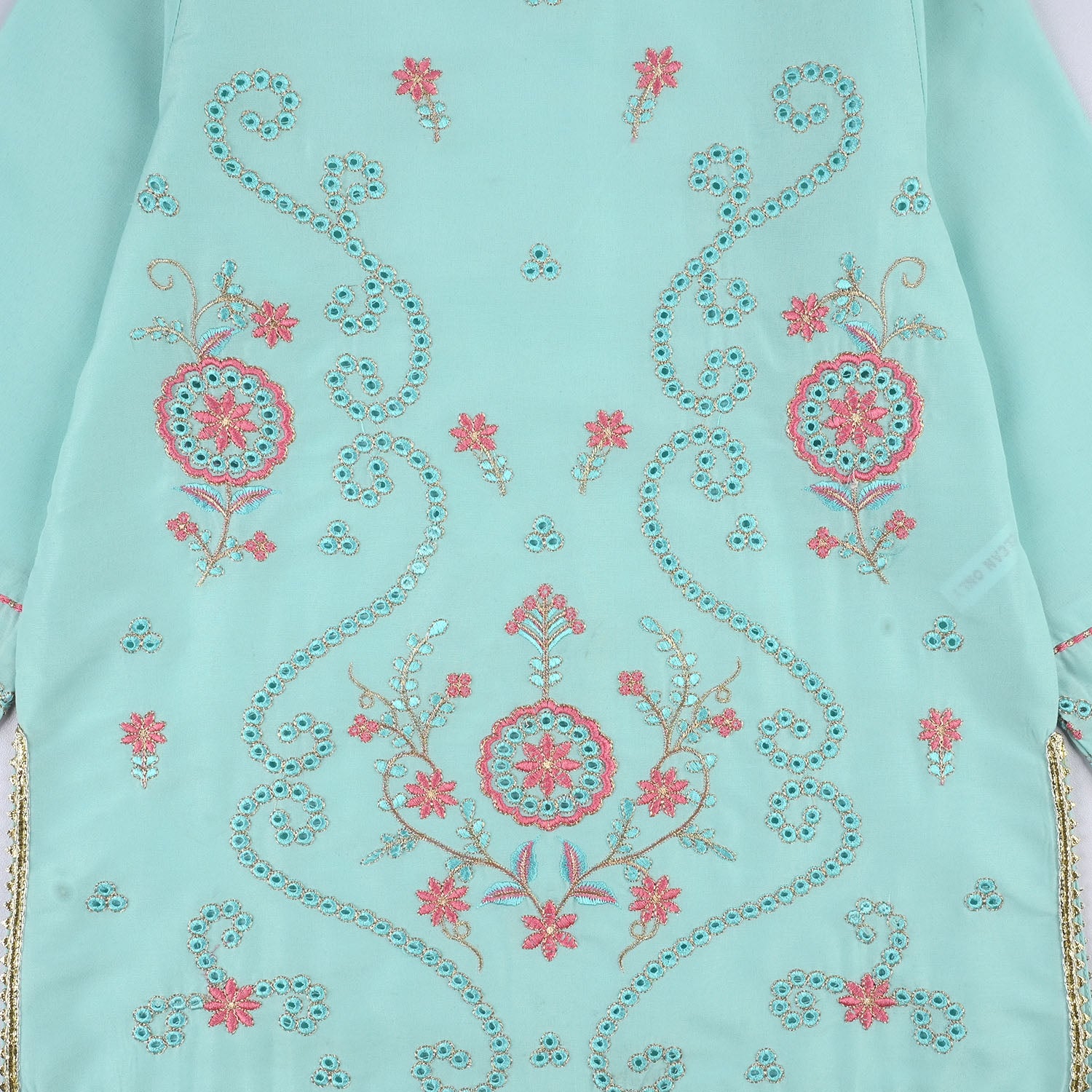 Teens girls' 3-piece Ghazal set in poly cambric featuring a round neck, full sleeves, matching bottoms, and a coordinating dupatta, perfect for a stylish and comfortable festive look.