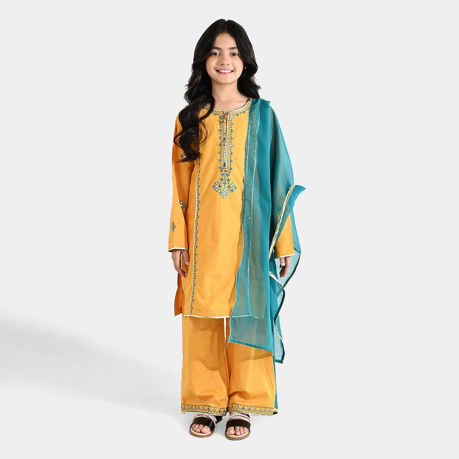 Girls jacquard 3pcs suit in yellow features embroidery, full sleeves, matching culottes, and a contrast green dupatta for a complete festive look.