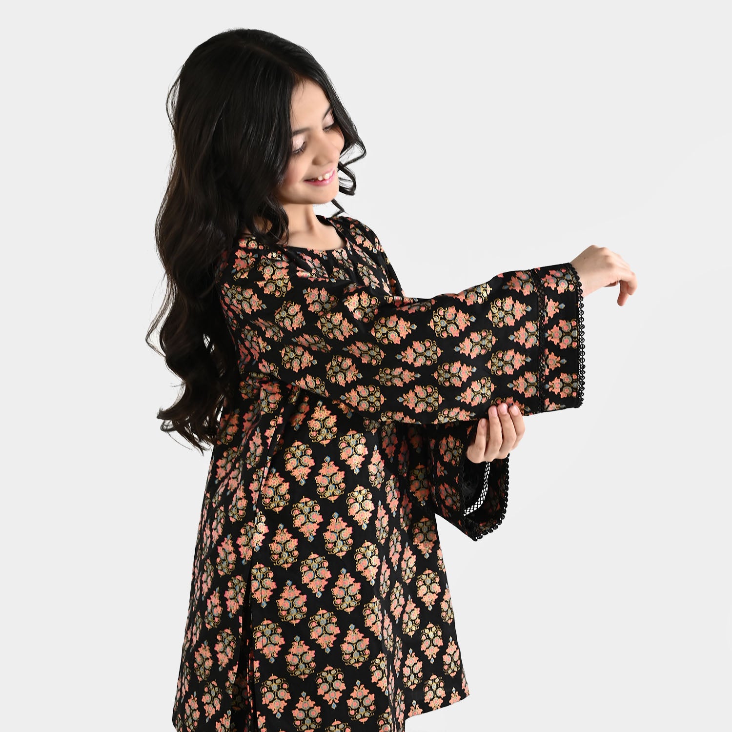 Girls' black printed 3-piece set features a round-neck, straight-fit shirt with lace detailing, matching loose-fit bottoms with lace accents, and a short waistcoat/koti for a complete and stylish traditional look.