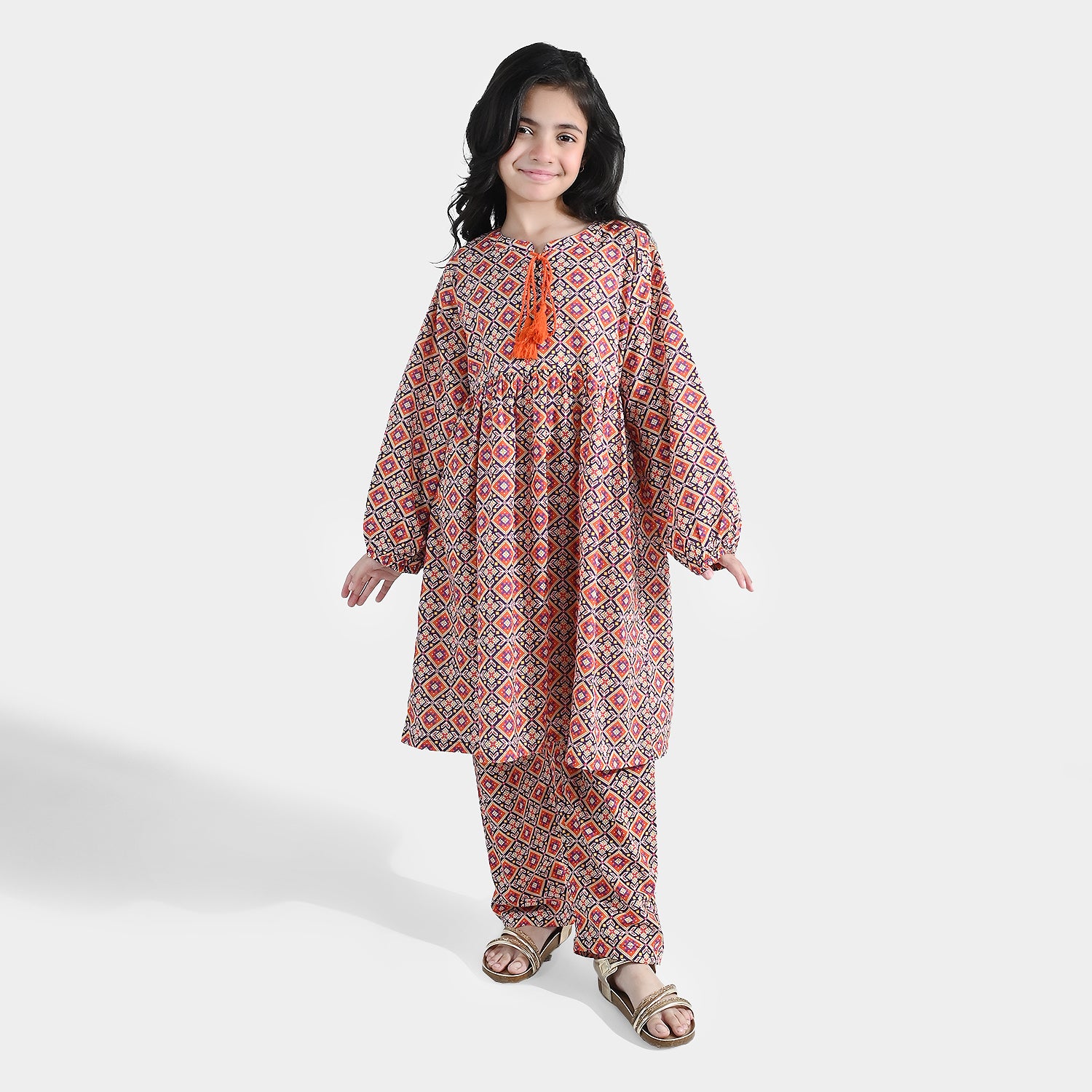 Girls’ cotton printed 2-piece set in multi, featuring a dori-neck frock, full sleeves with elastic hem, and matching bottoms.