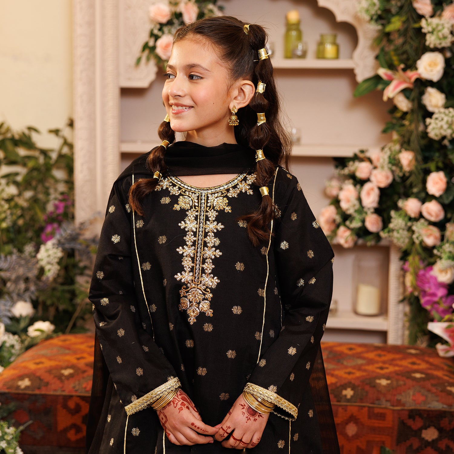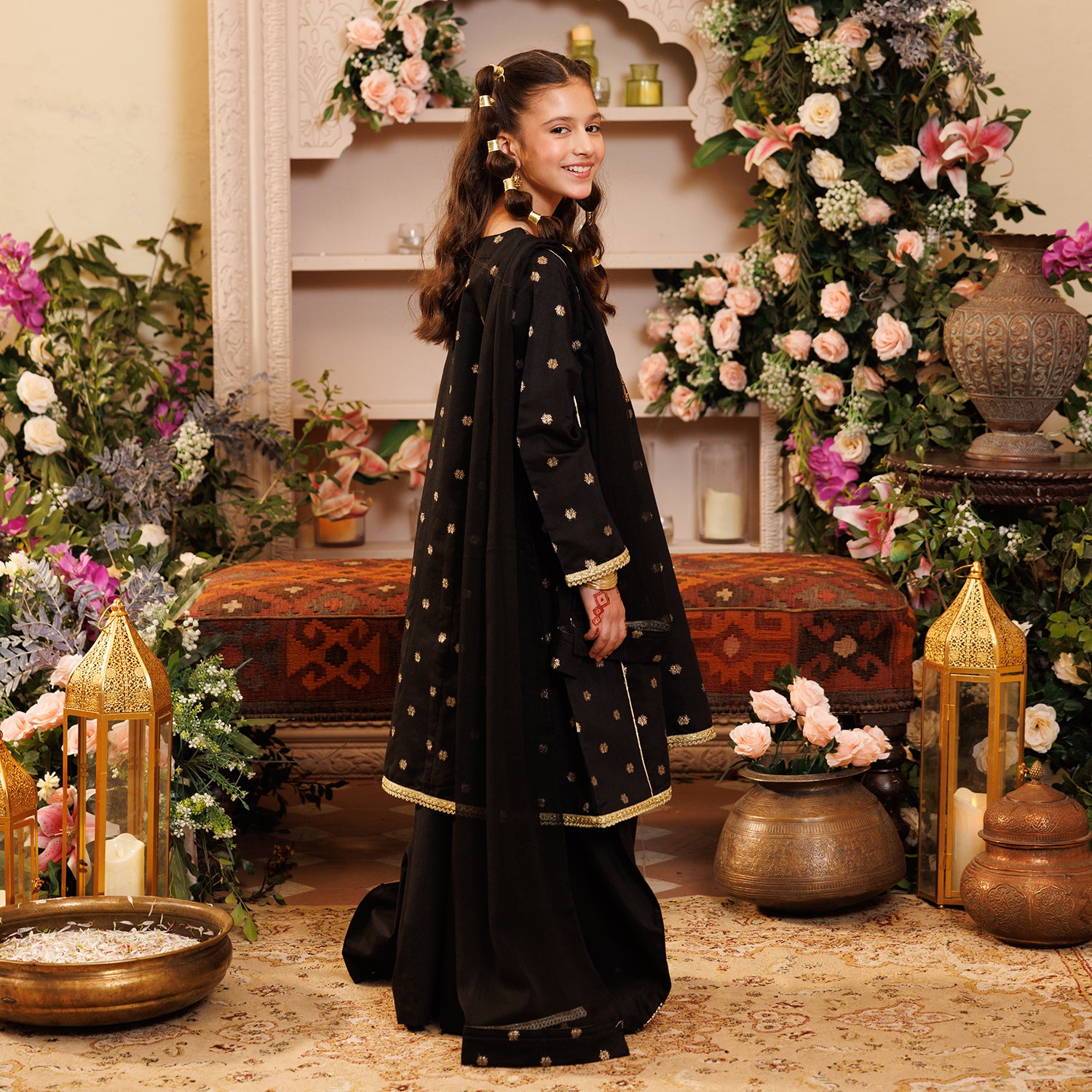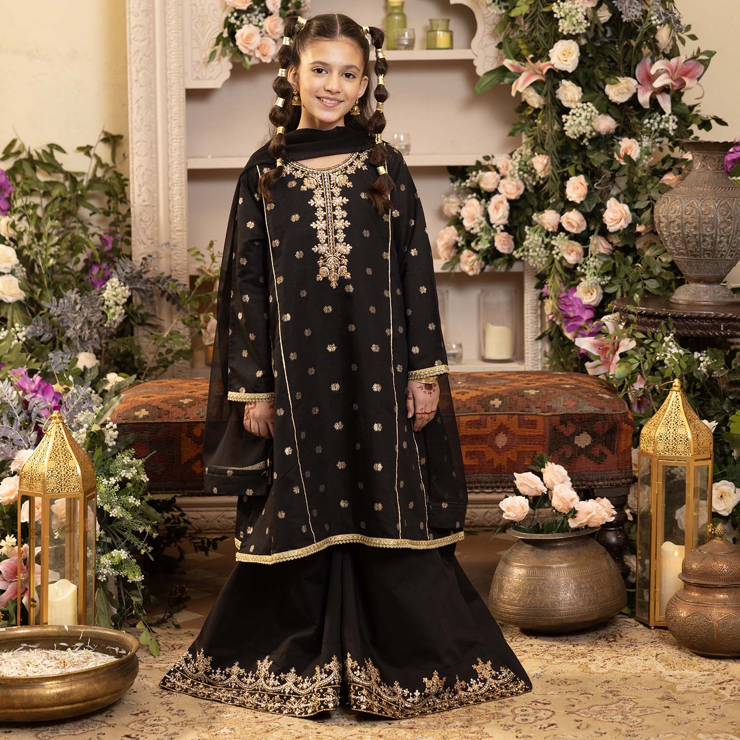 Girls' black jacquard 3-piece set featuring a round-neck, full-sleeve kameez with matching culottes and coordinating dupatta, perfect for a stylish and festive everyday look.