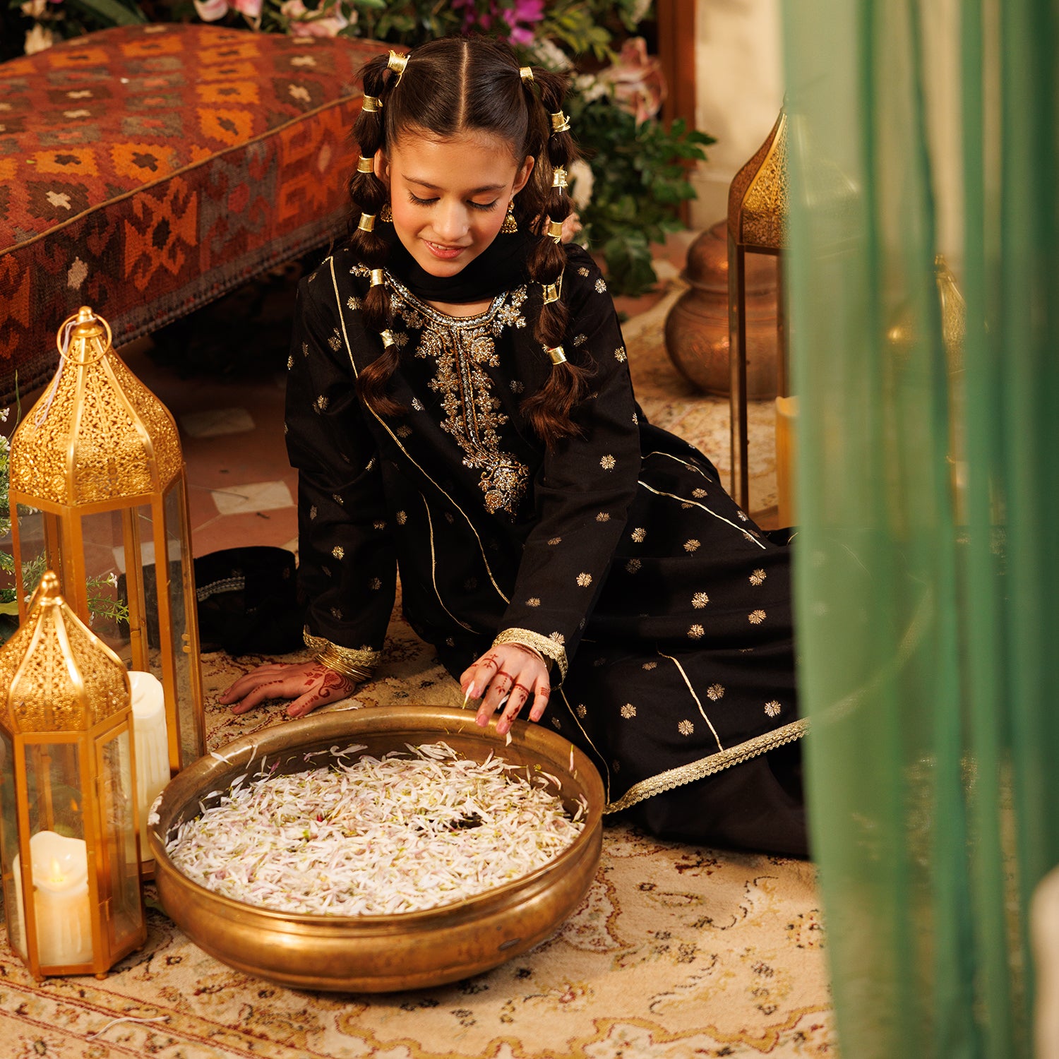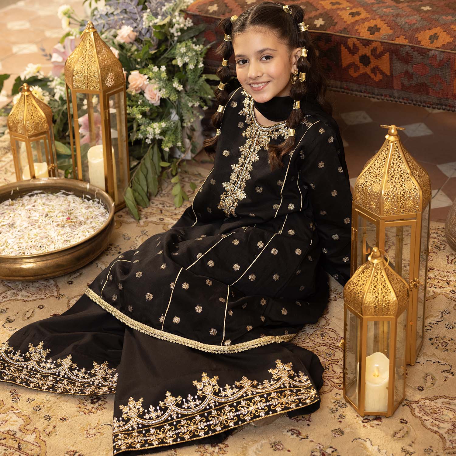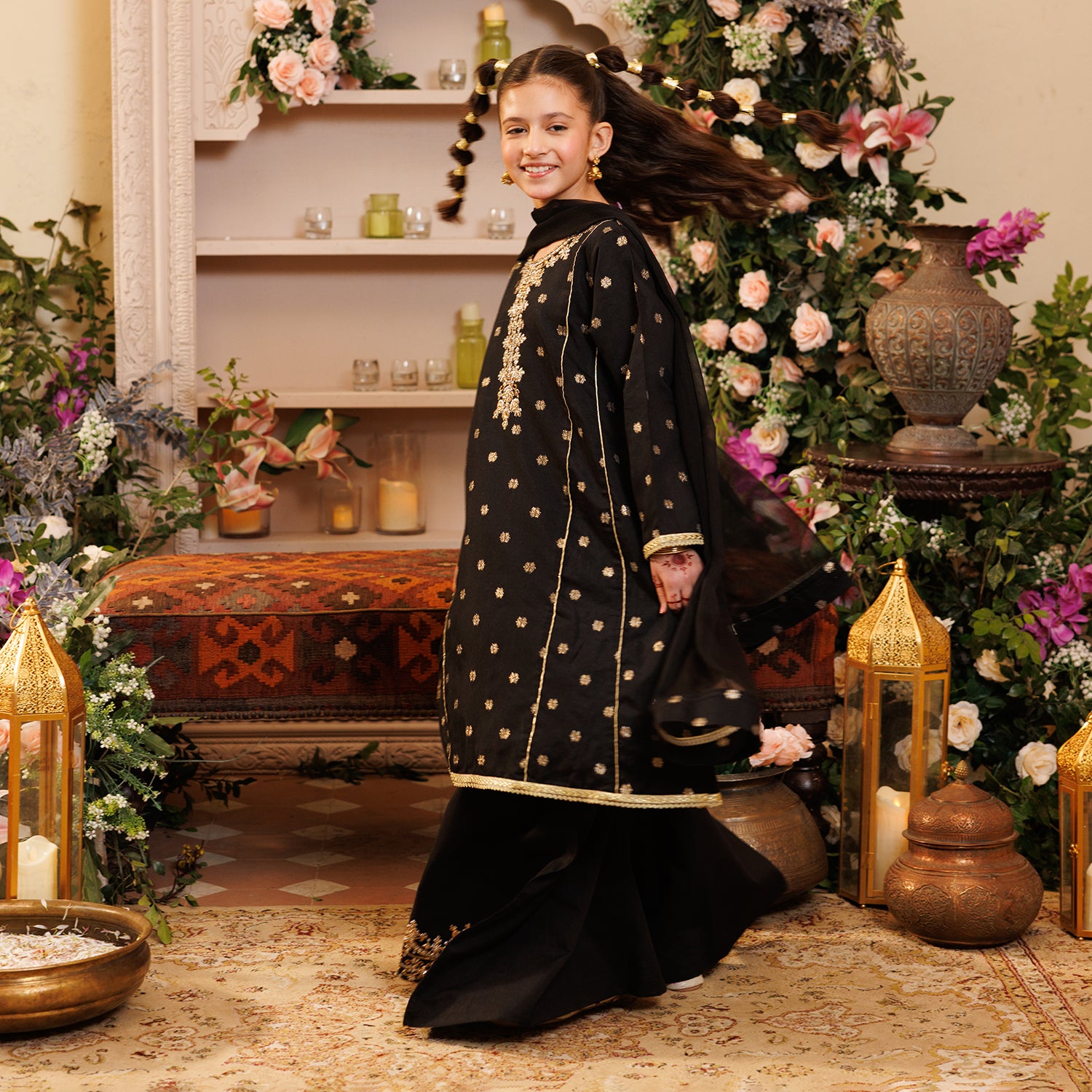 Girls' black jacquard 3-piece set featuring a round-neck, full-sleeve kameez with matching culottes and coordinating dupatta, perfect for a stylish and festive everyday look.