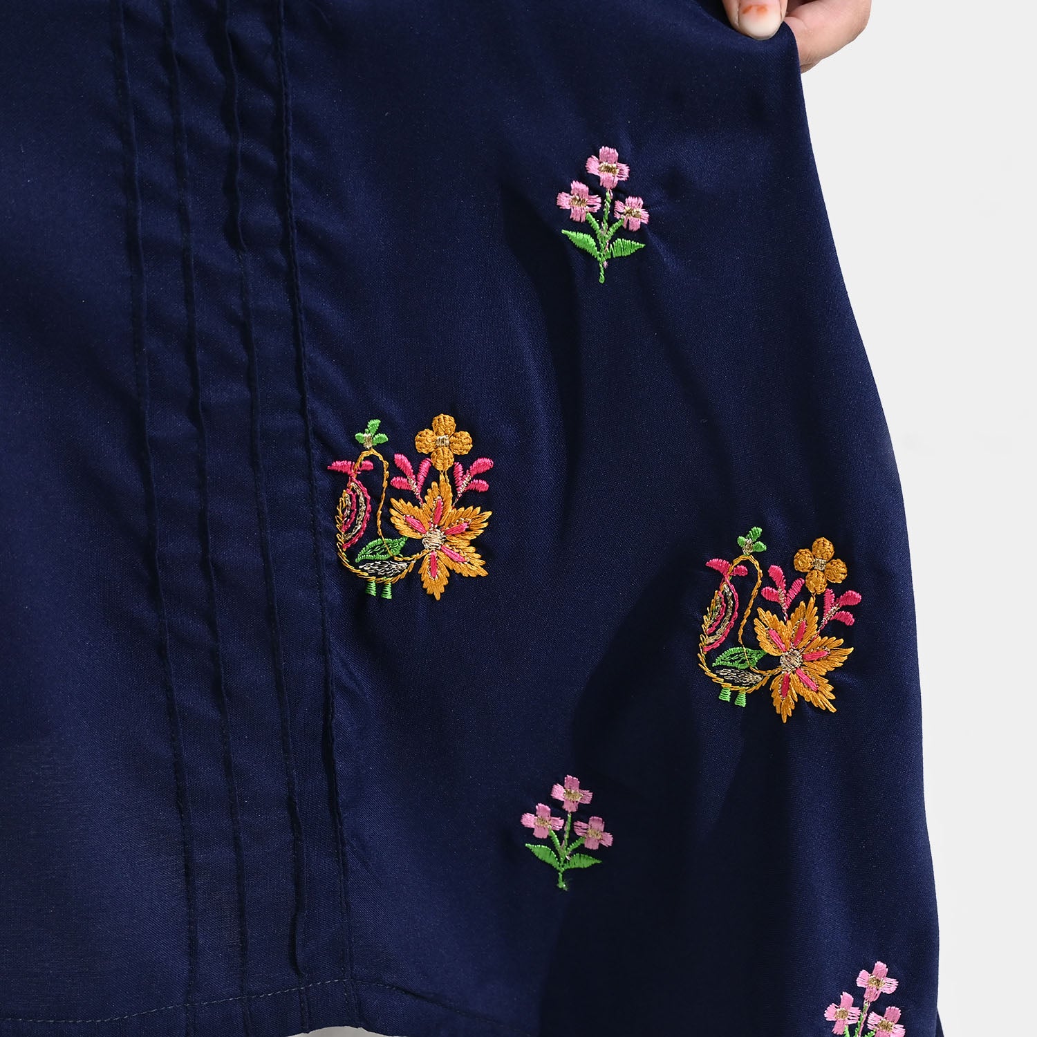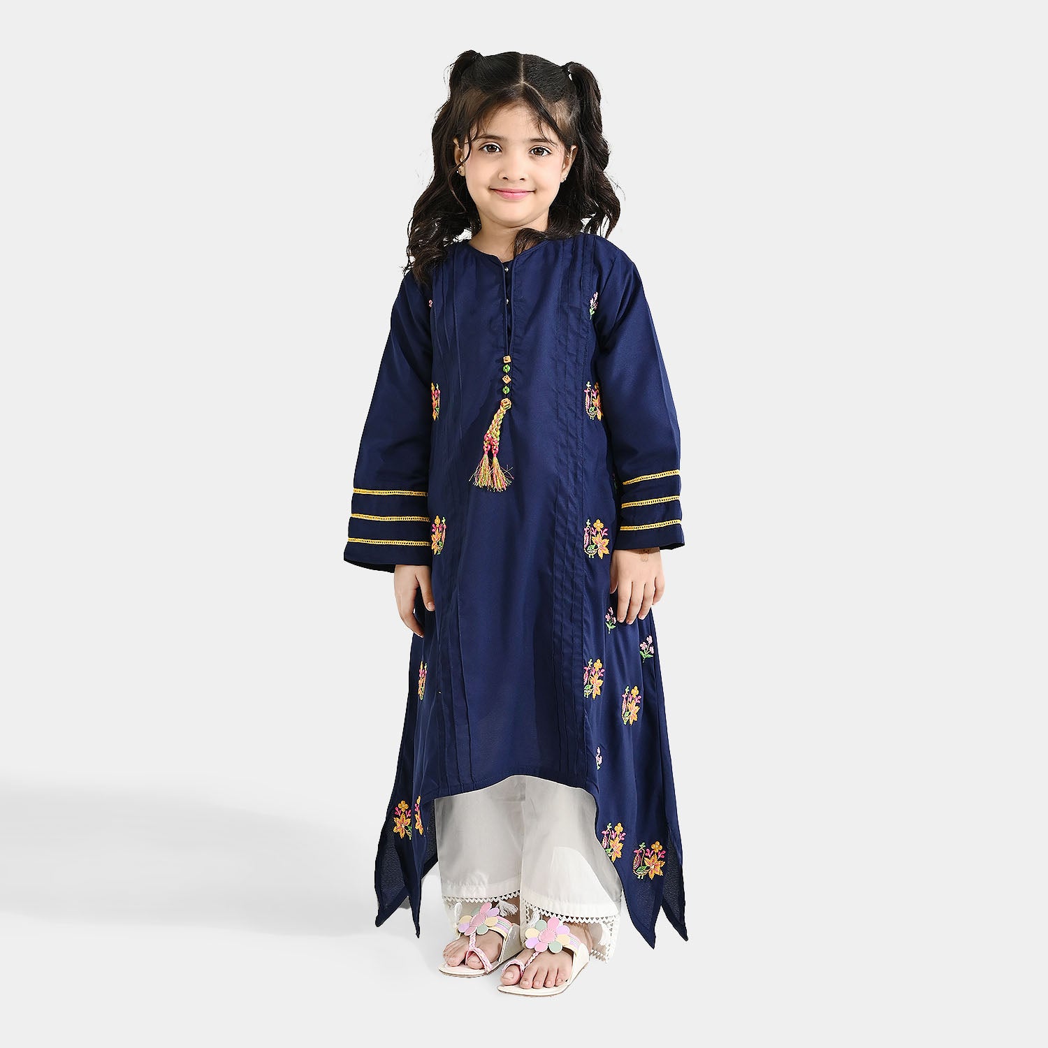 Girls' navy blue poly cambric kurti featuring full sleeves, lace detailing, a stylish A-line cut, and tassel accents, perfect for a trendy and comfortable everyday look.
