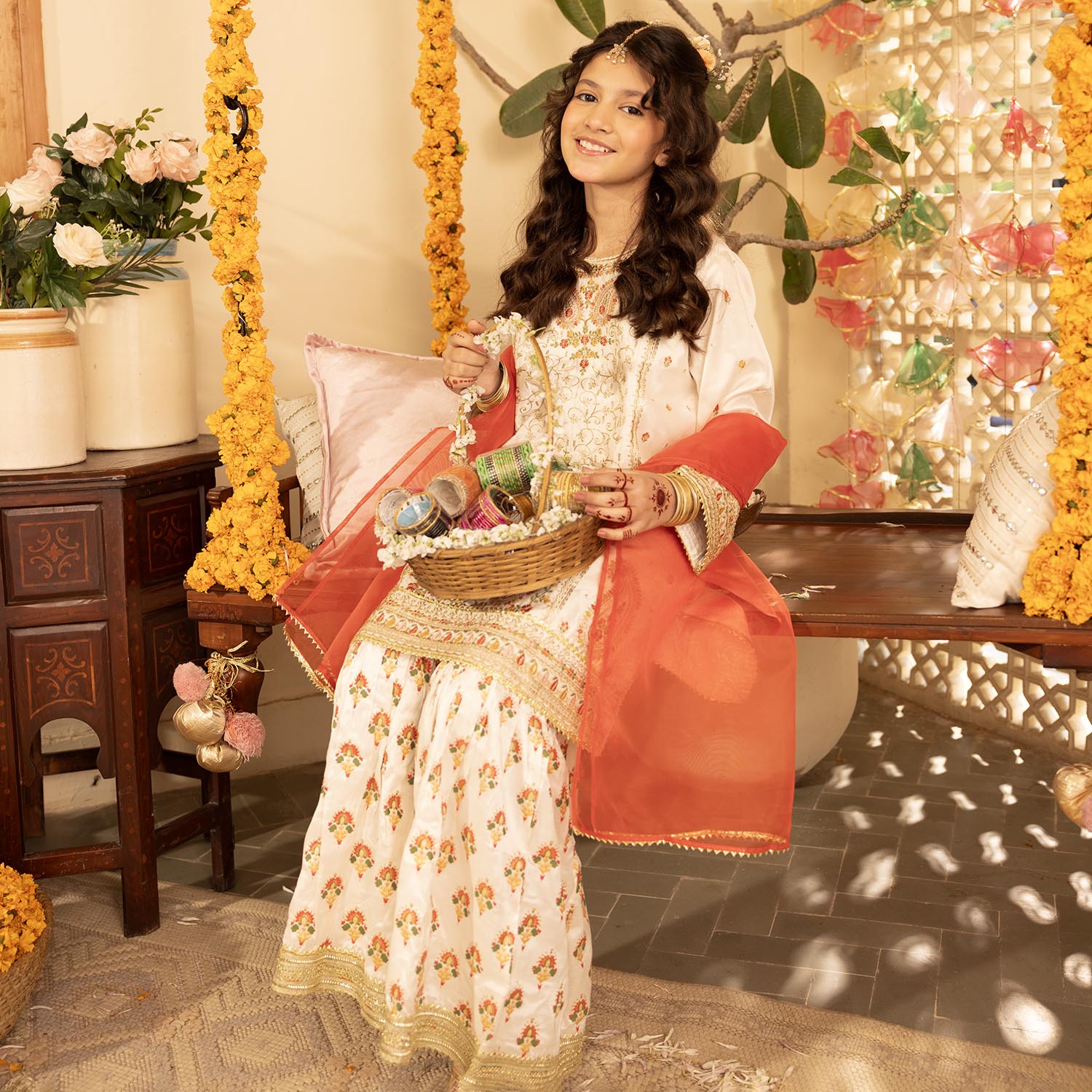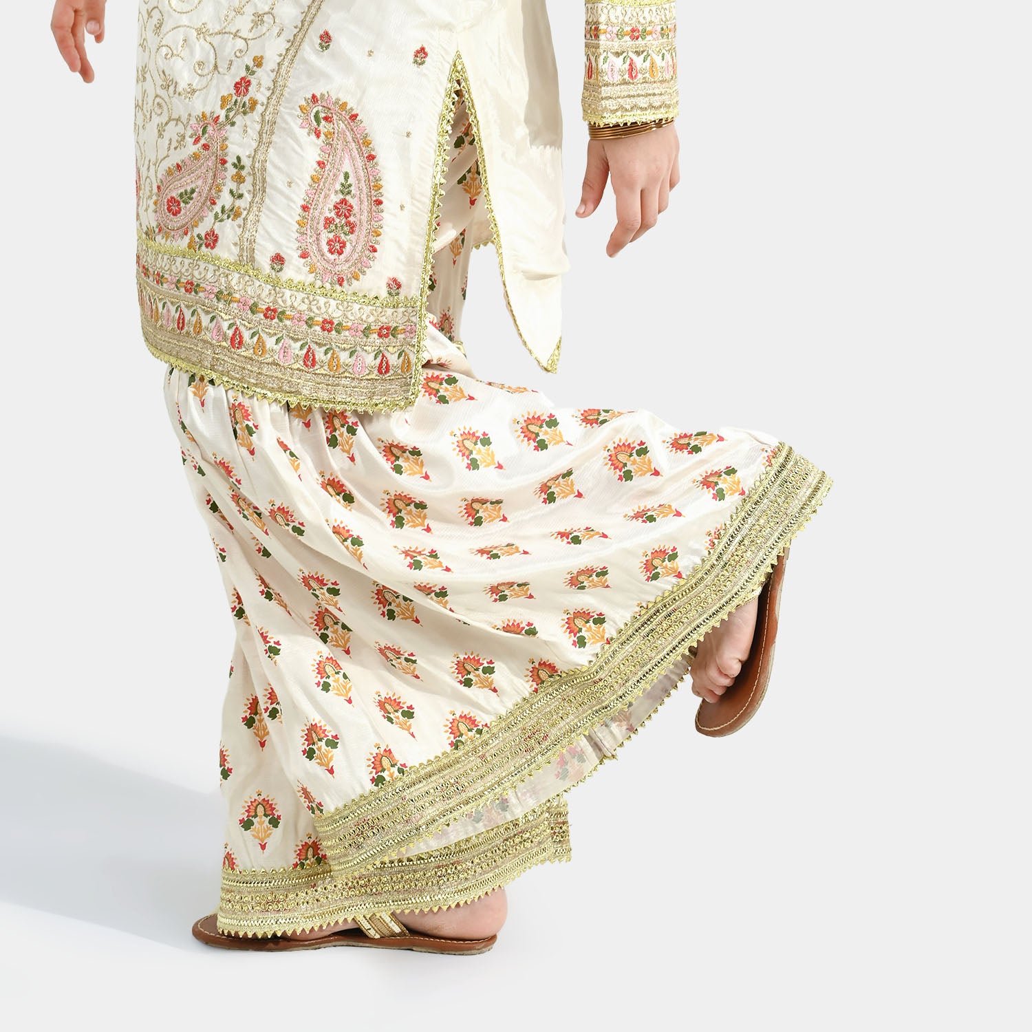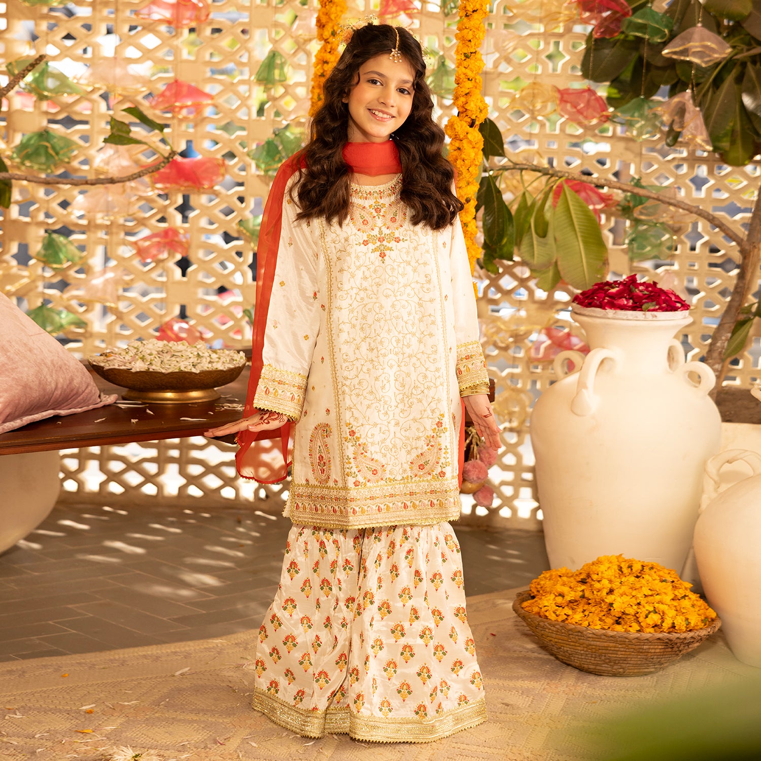 Girls’ raw silk 3-piece set in off-white featuring an embroidered straight-fit shirt with full sleeves, matching gharara, and contrasting dupatta, perfect for a stylish and traditional look.