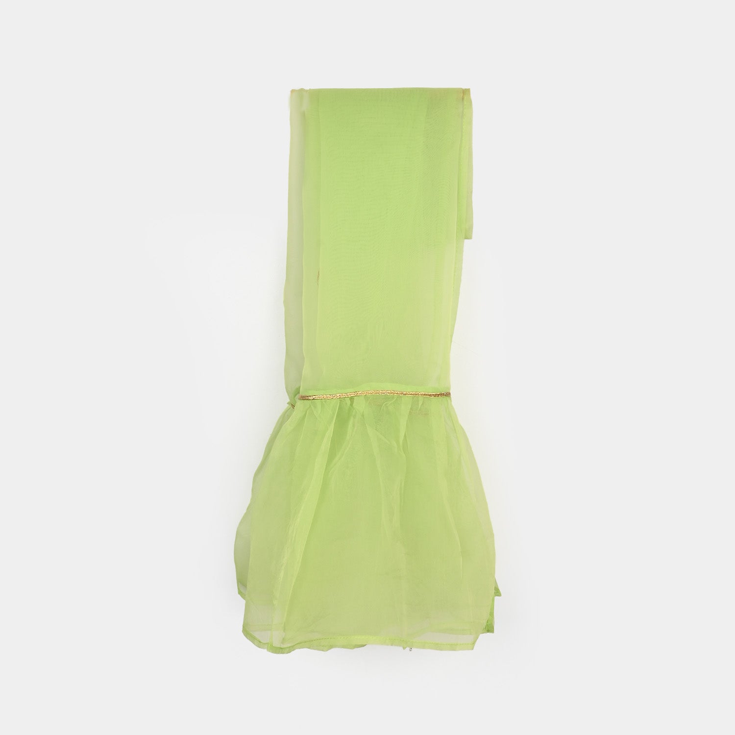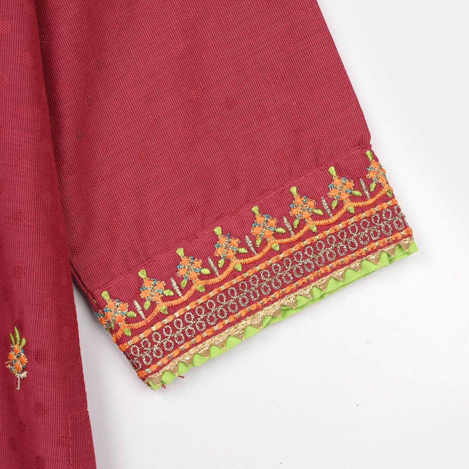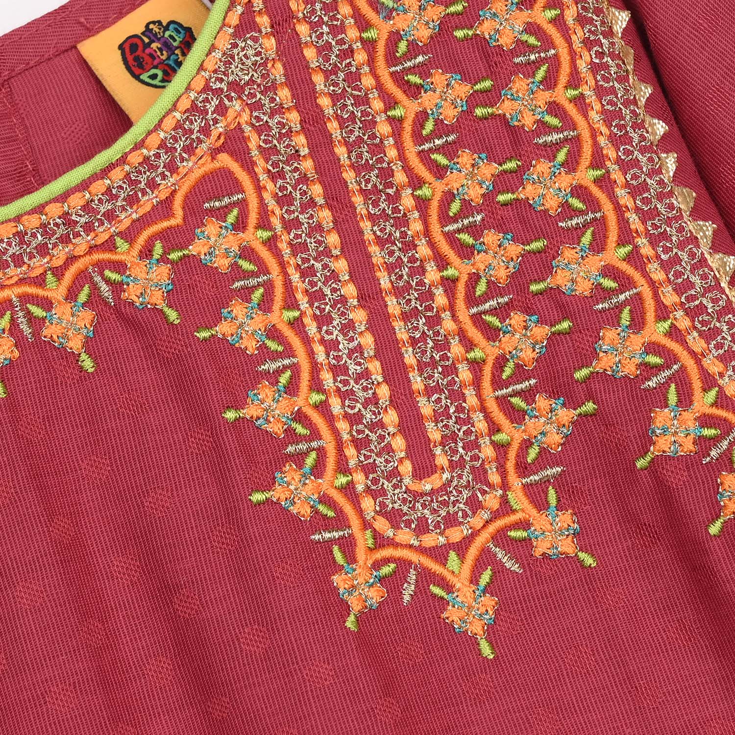 Girls' magenta viscose 3-piece set featuring a full-sleeve embroidered shirt, matching tulip trousers with contrast detailing, and a contrast green dupatta, perfect for a stylish and festive look.