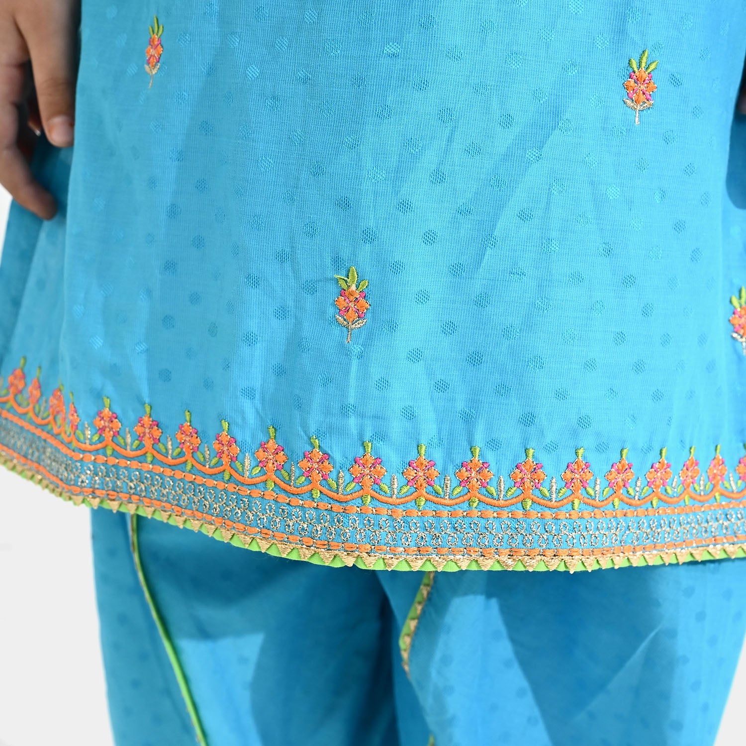 Girls’ viscose 3-piece set in teal blue featuring an embroidered full-sleeve shirt, tulip pants with lace detailing, and a contrasting green dupatta, perfect for a stylish and comfortable traditional look.