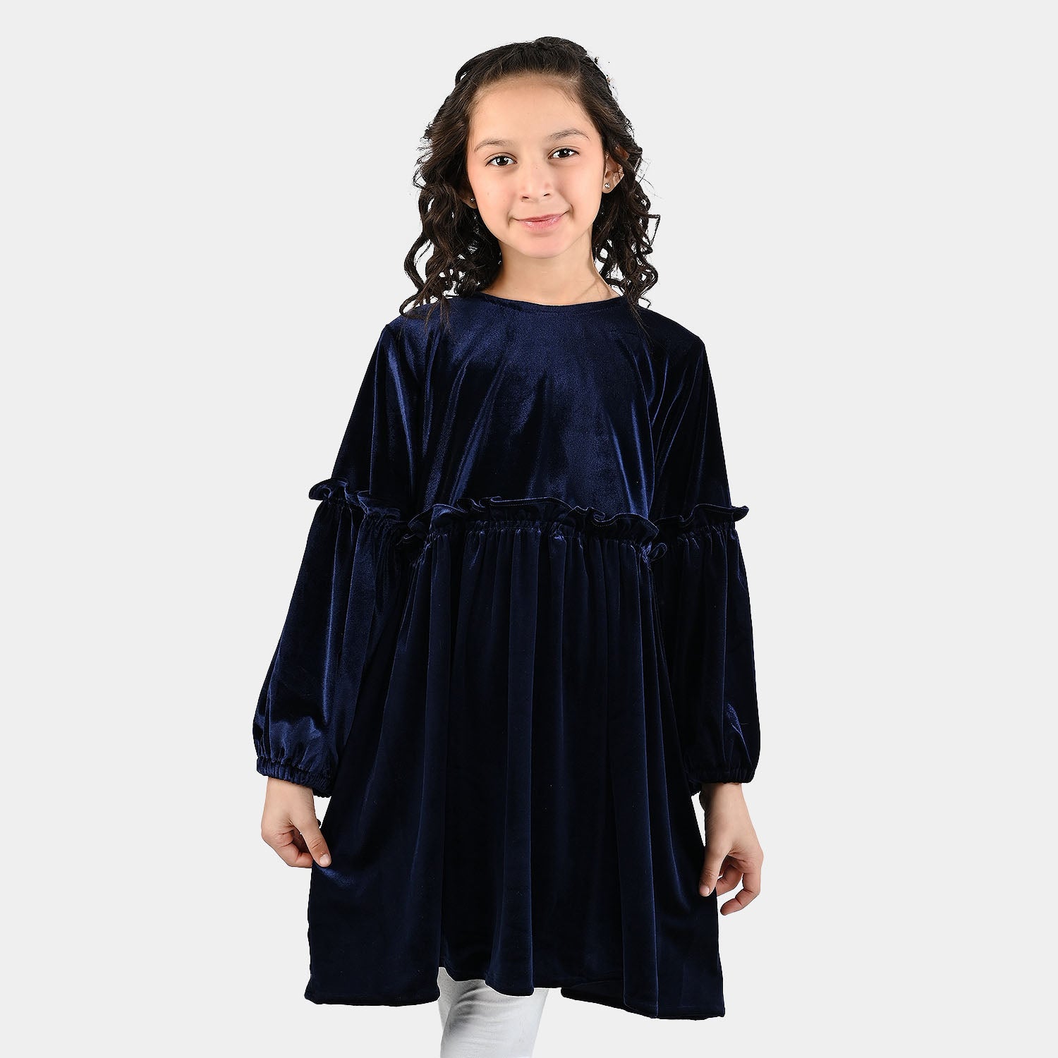 This navy blue velvet top for girls features charming sleeves that enhance its fashionable appeal. Crafted from plush velvet fabric, it provides warmth and softness, combining comfort with style ideal for special events and cooler weather.