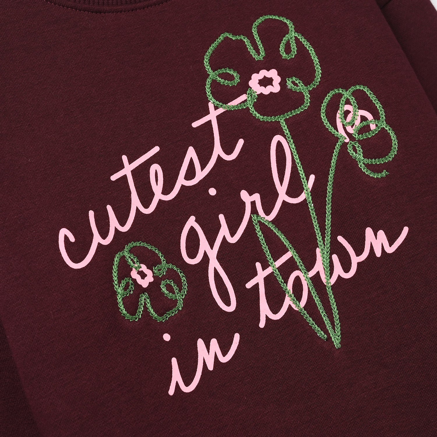 Infant girls fleece sweatshirt in maroon featuring an embroidery on front, full sleeves, and a round neck. Soft, cozy, and easy to pair with any bottoms.