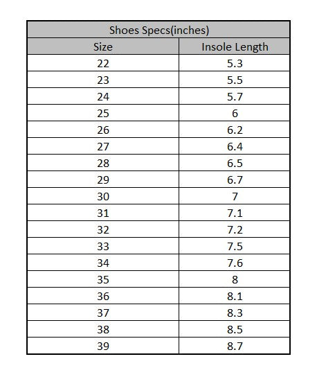 For Shoes: Please allow 0.2 inch +/- tolerance due to manual measurement.