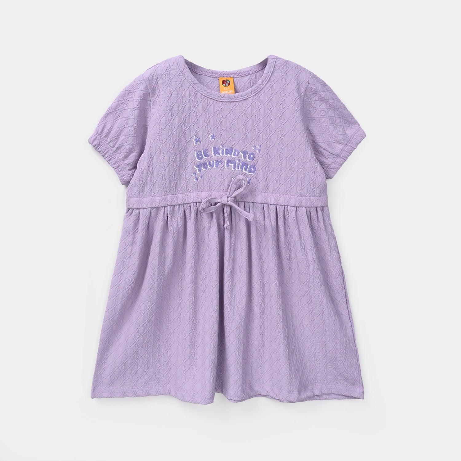 Girls’ purple jacquard knitted frock with a round neck, half sleeves with elastic hems, and a bow on the front, featuring a “Be Kind” graphics.