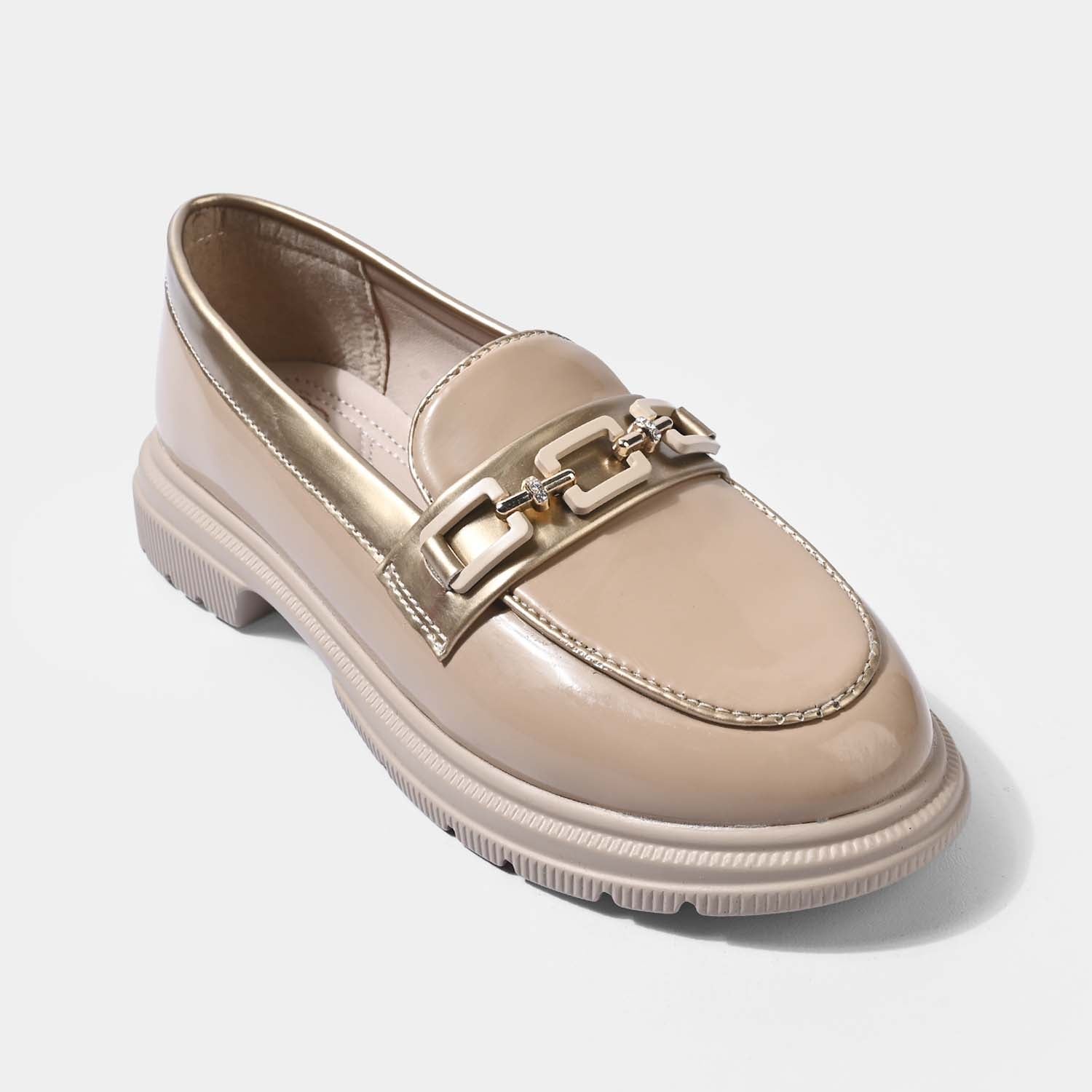 Elegant loafers in beige with a shiny finish and golden detailing, perfect to wear with both eastern and western outfits.