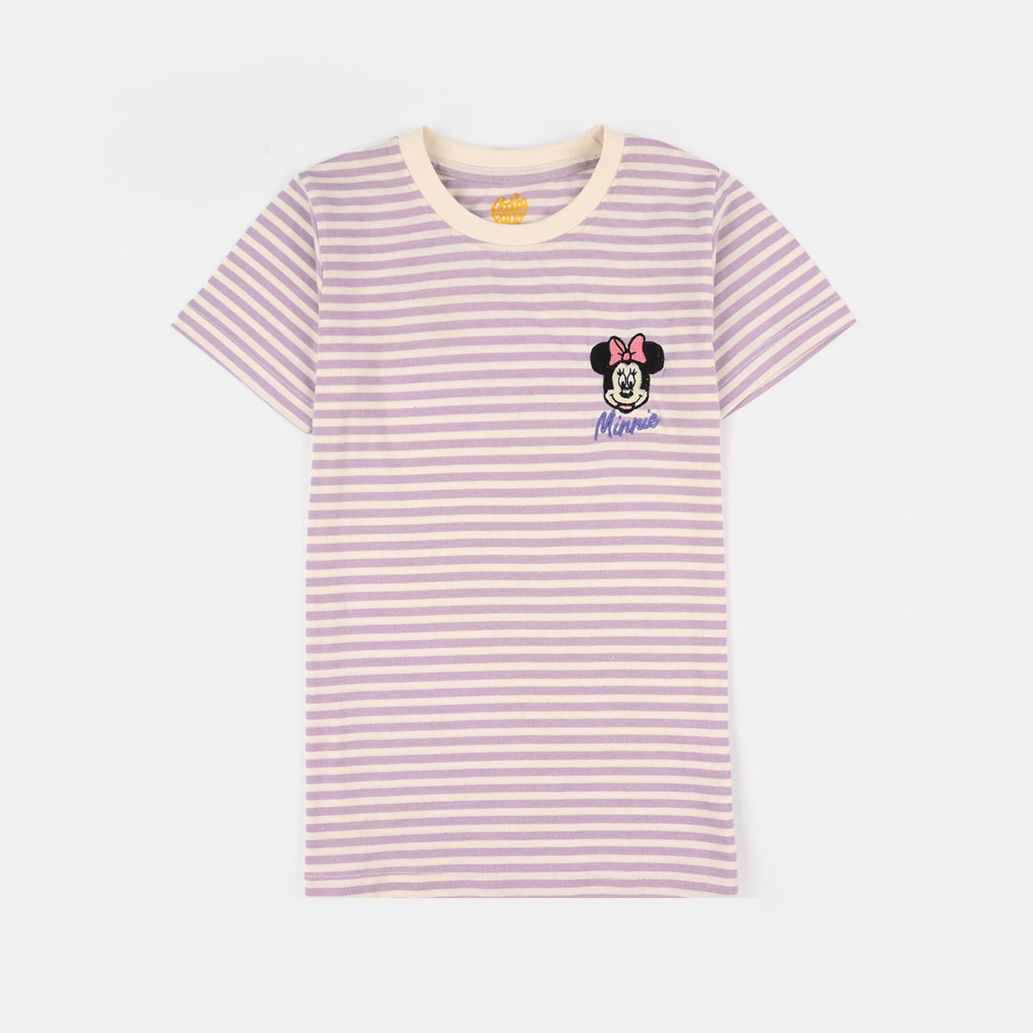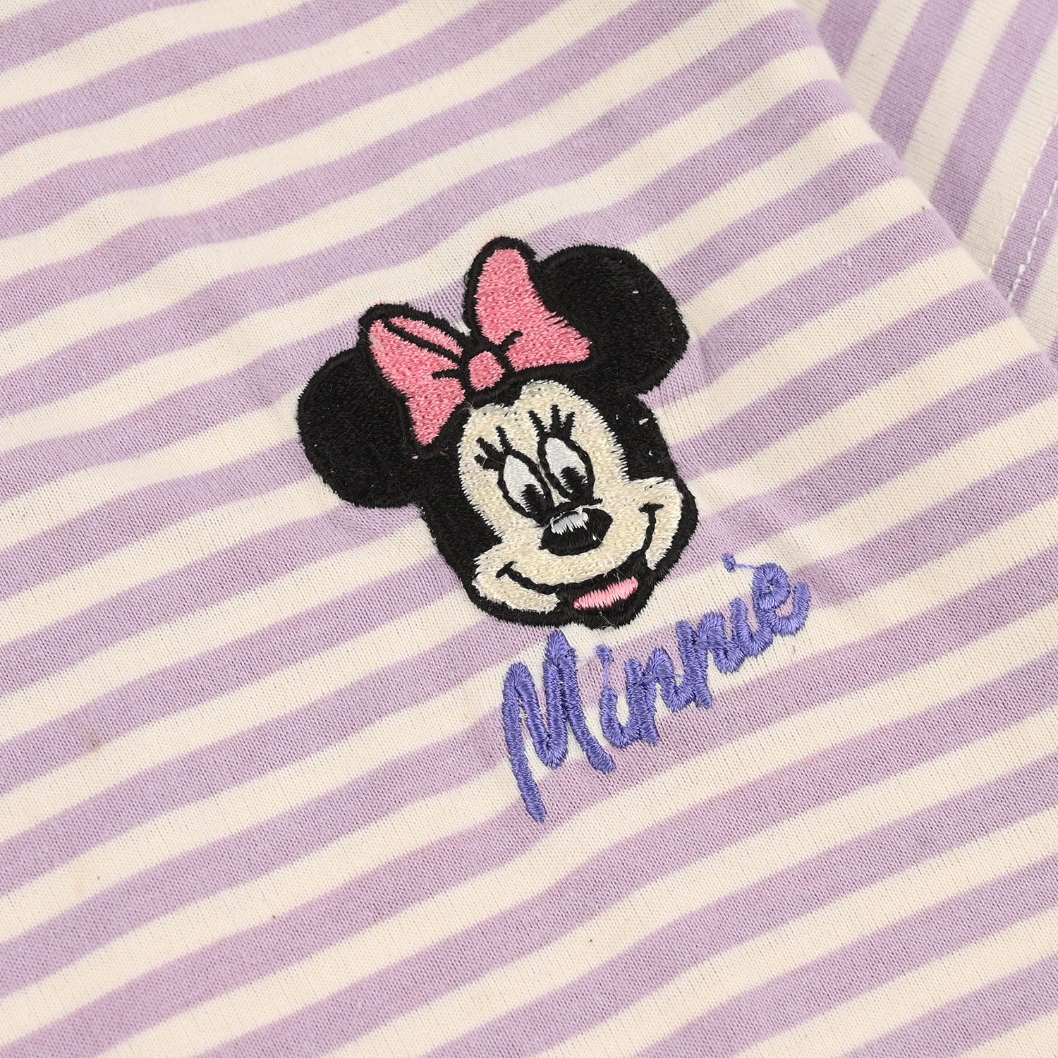 Girls' pastel lilac and white poly-cotton jersey night suit featuring a round neck, half sleeves, a striped pattern, and a Minnie Mouse print, perfect for a cozy and comfortable everyday sleep.