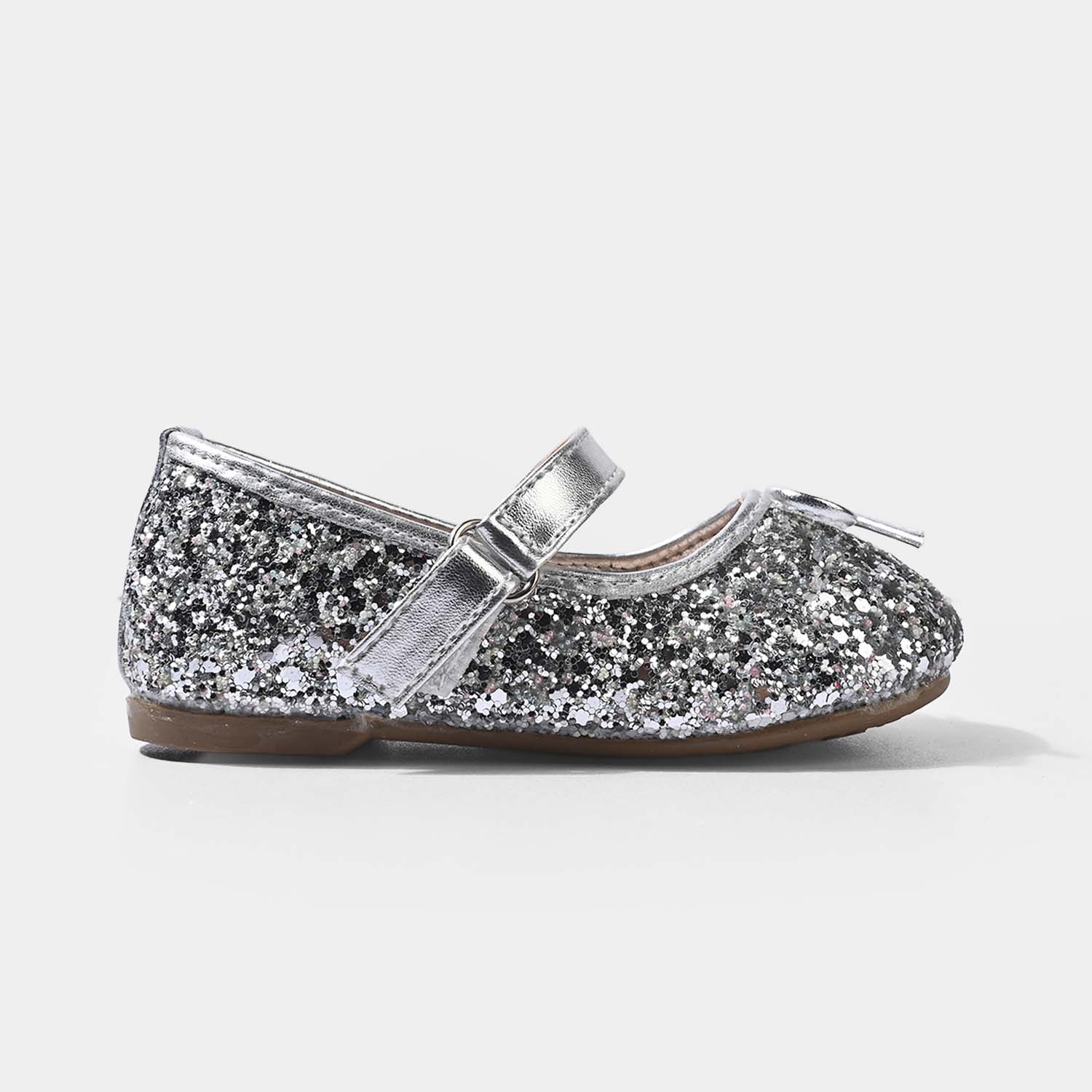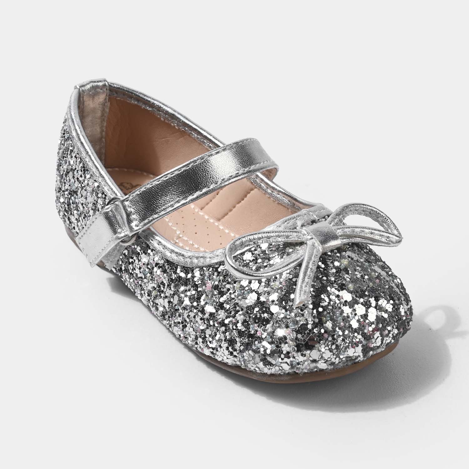 Girls pump heels featuring a charming glittery finish and a cute front bow, designed with soft, comfortable heels for all-day wear.
