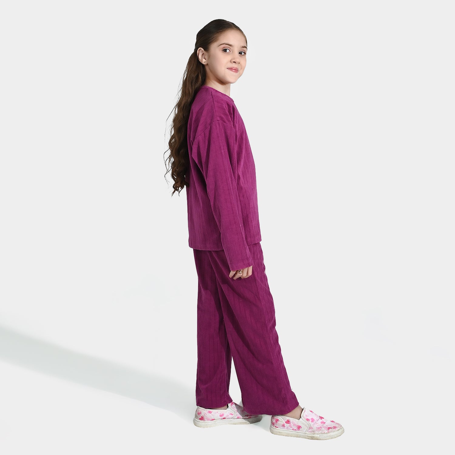 Girls purple jacquard 2-piece set with a round-neck, full-sleeve shirt and wide-leg matching pants, featuring a coordinated look and all-day comfort.