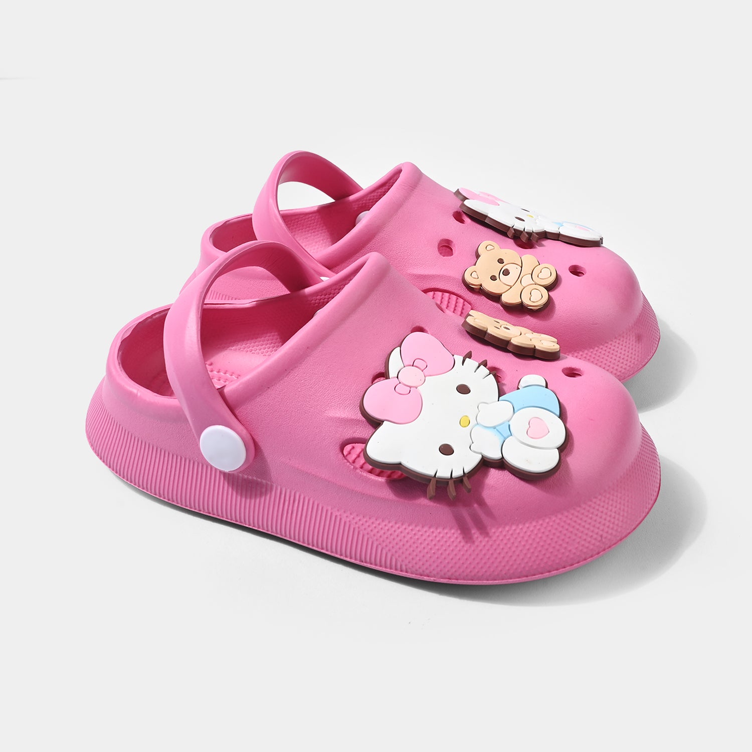 Girls’ fuchsia clogs with Hello-Kitty themed embellishments on top and a back strap for a secure, comfortable fit.