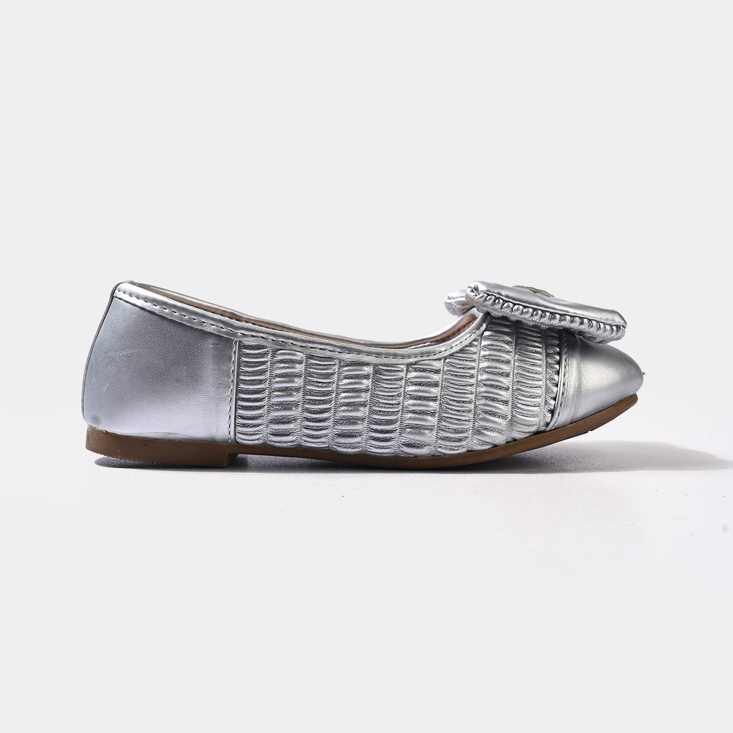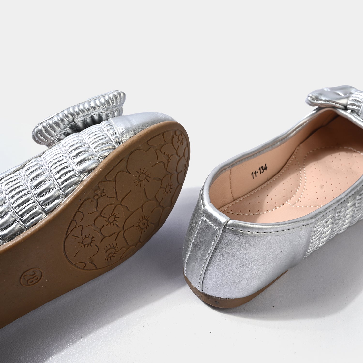 Girls’ silver pumps feature a shiny finish with a bow embellishment on top, offering a cute look perfect for everyday wear.