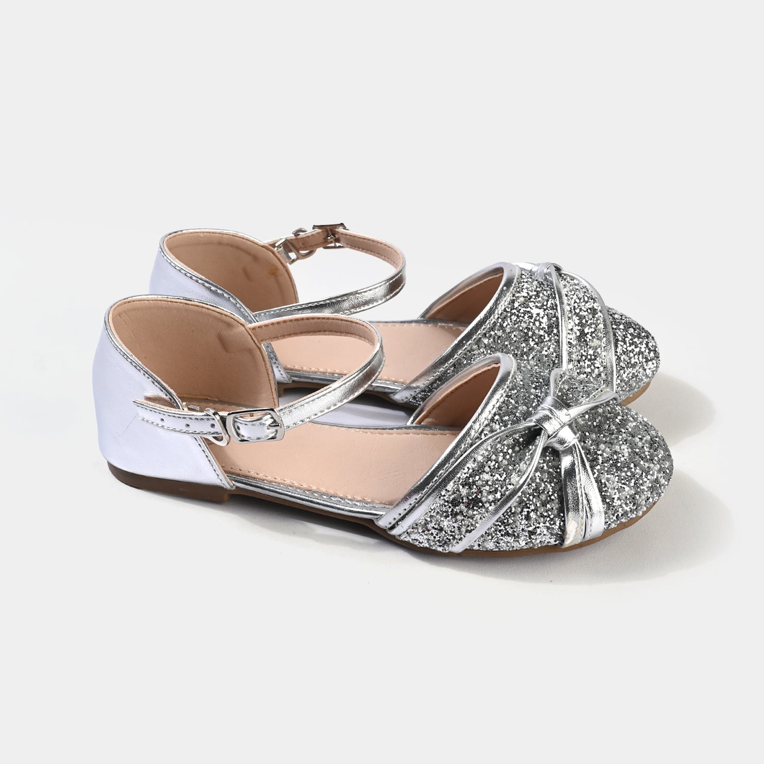 Girls’ pumps in silver featuring a secure buckle strap, glittery finish, and detailed design, perfect for occasional or festive wear.