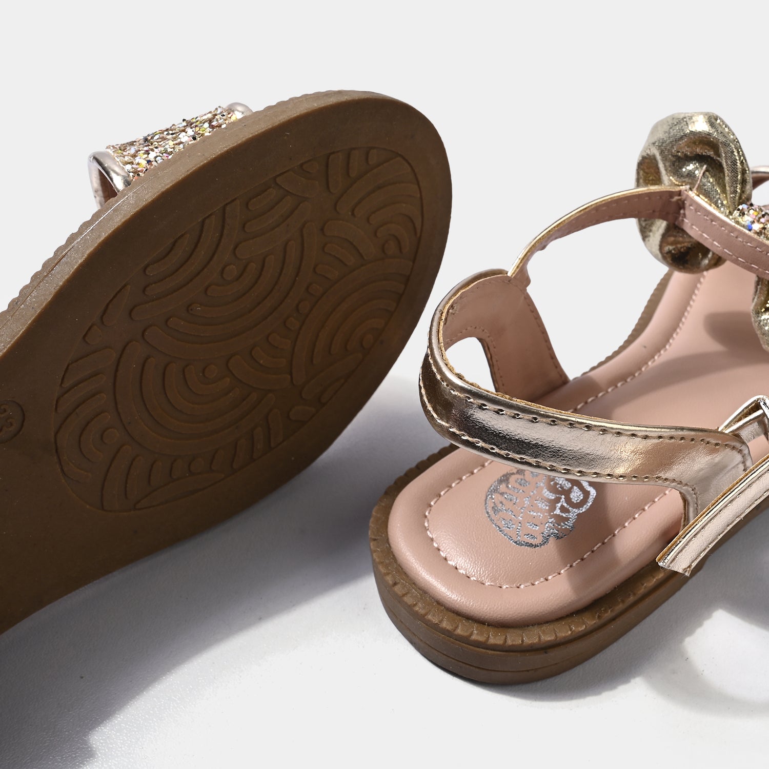 This golden flat sandal features a glittery front strap with a bow detail on the strap. The adjustable ankle strap with a secure buckle ensures easy movement and all-day comfort.