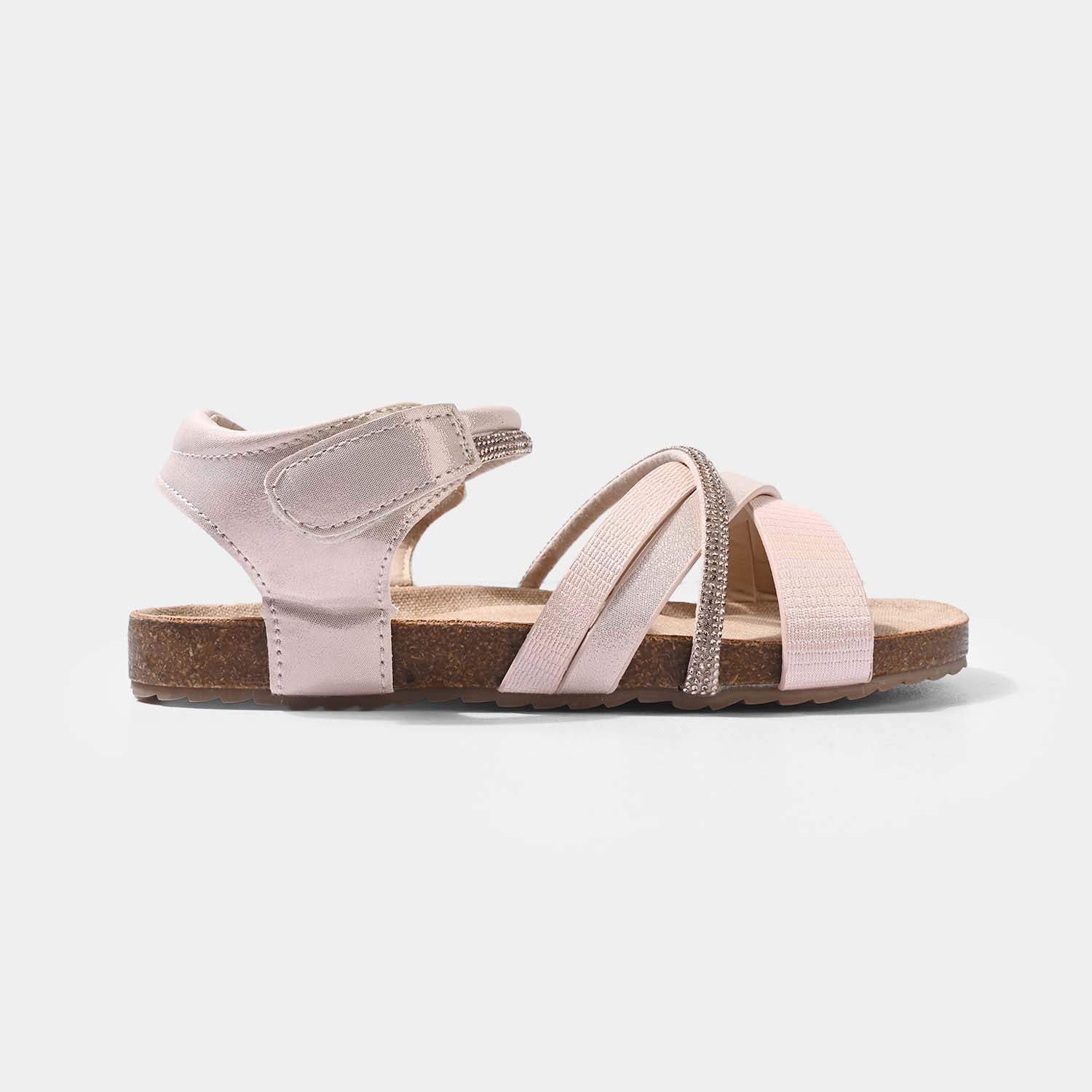These pink girls sandals feature cross-style straps with a silver glittery effect and a secure strap, providing a comfortable and safe fit.