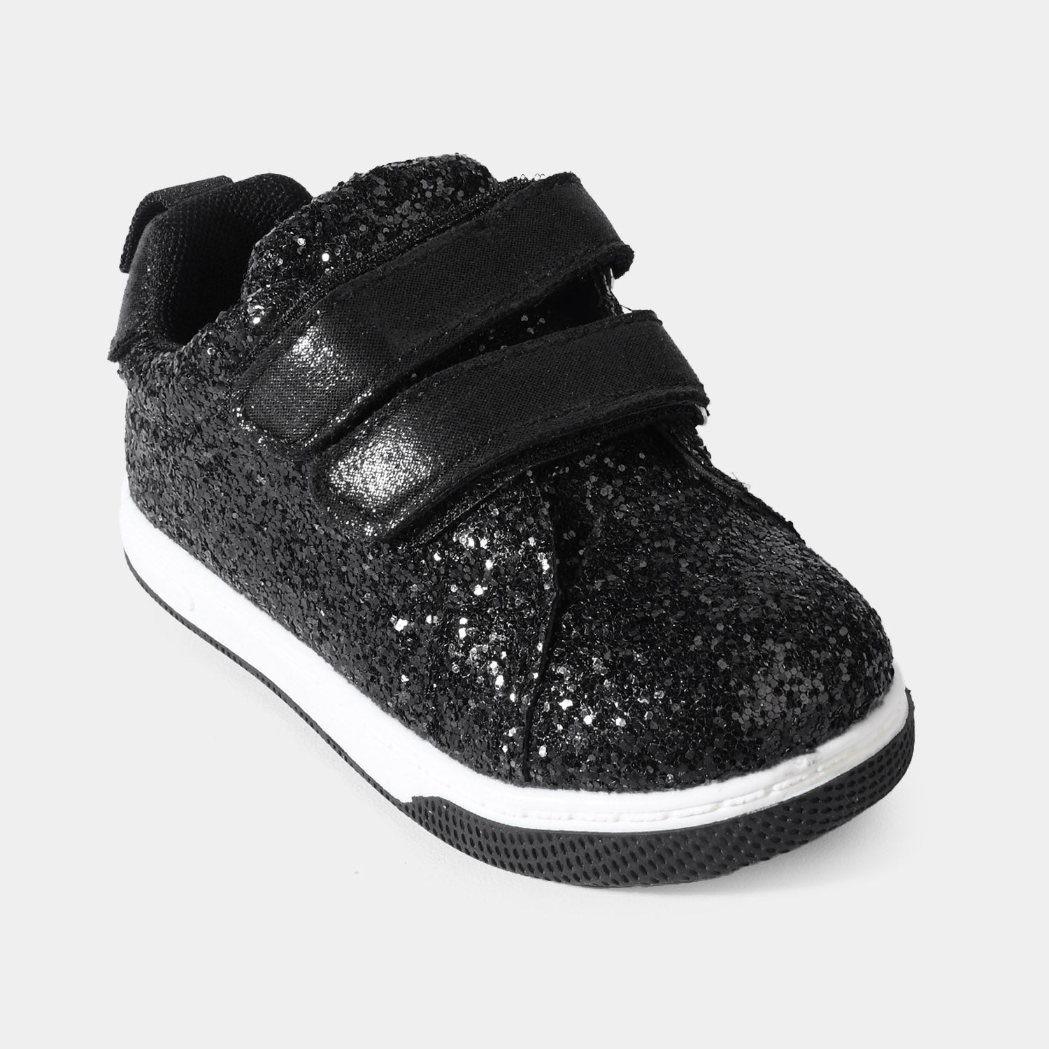 Black girls' sneakers feature a glittery finish for a stylish look. Designed with a double strap, this style is easy to wear, providing a secure and comfortable fit, perfect for everyday wear.