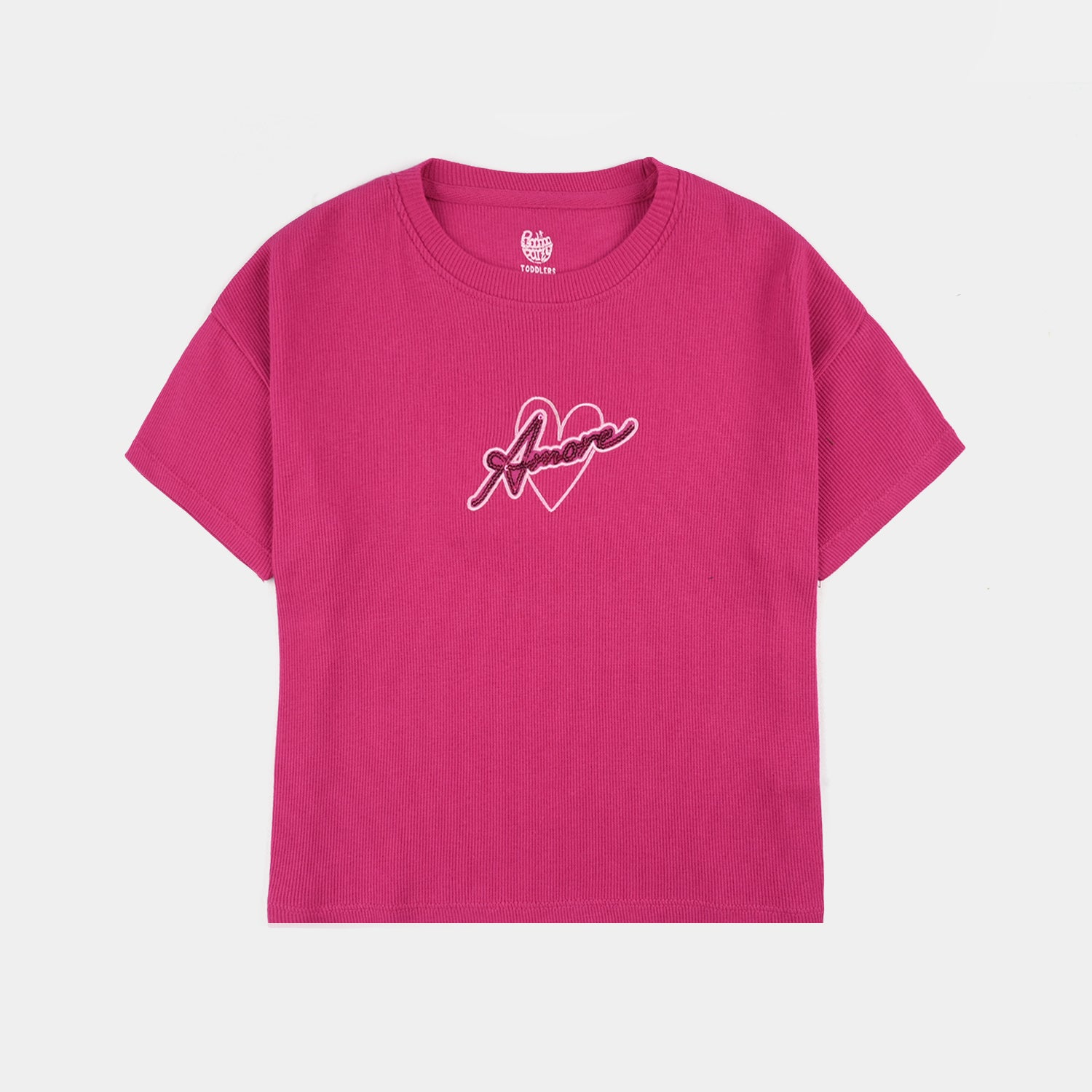 Girls’ 2x1 rib T-shirt in hot pink featuring a round neck, half sleeves, and “Amore” print detailing, perfect for a comfortable and playful everyday look.