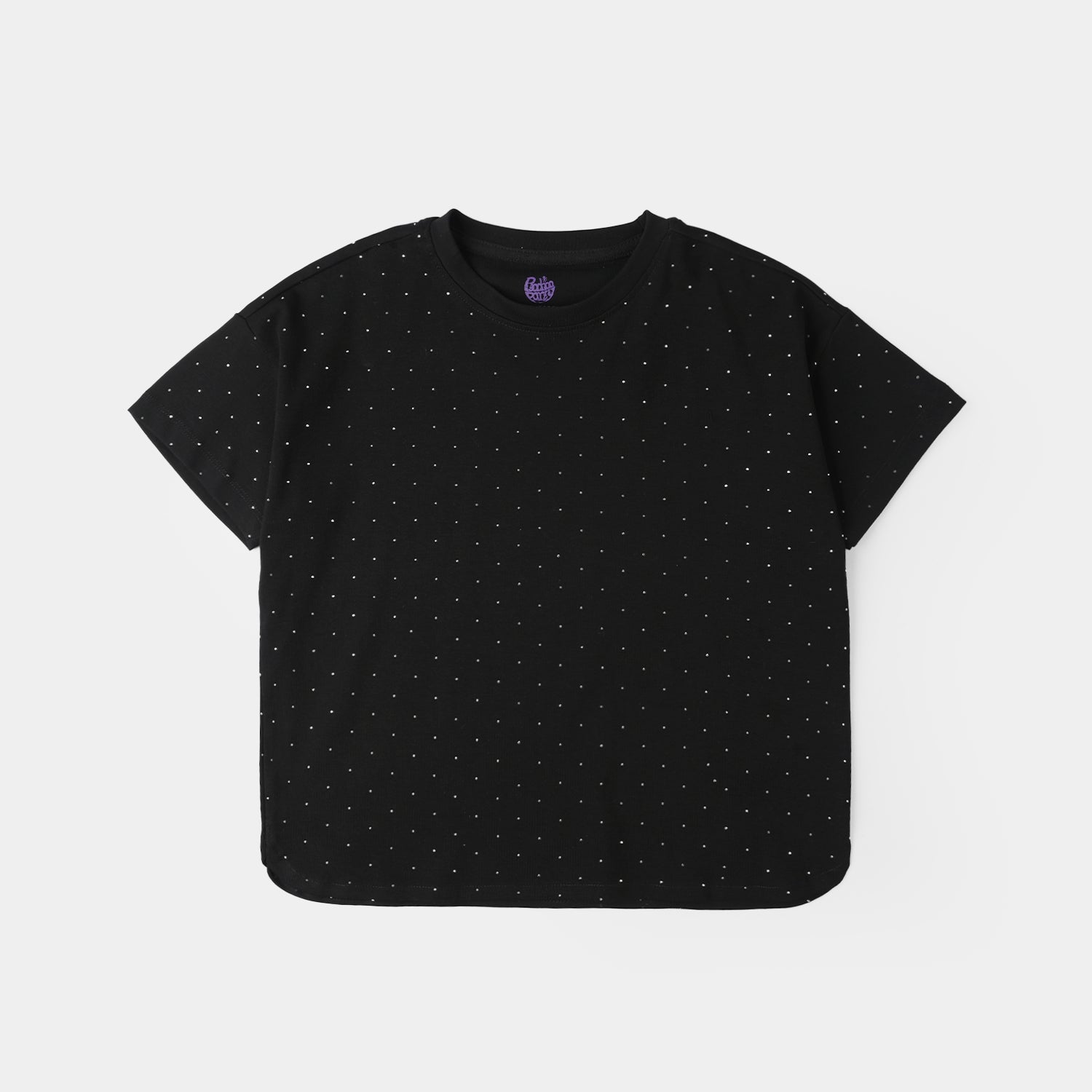 This black jersey/terry T-shirt for girls features a round neck, half sleeves, a rounded hem, and all-over silver stud detailing, perfect for a comfortable and stylish everyday look.