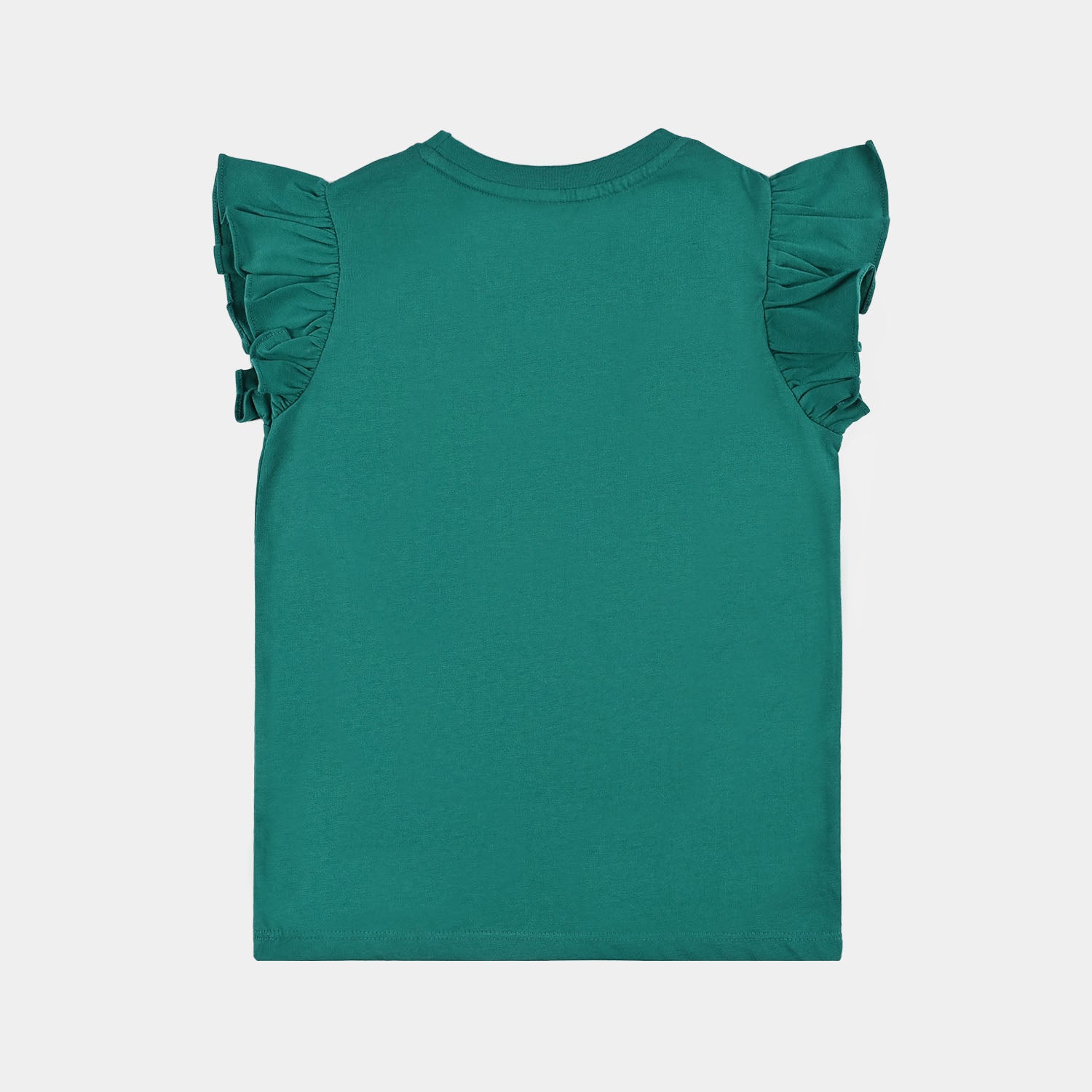 Girls’ jersey/terry t-shirt in green featuring half sleeves with ruffle detailing, a round neck, and a “Sunny Club” print, perfect for a cute and comfortable everyday look.