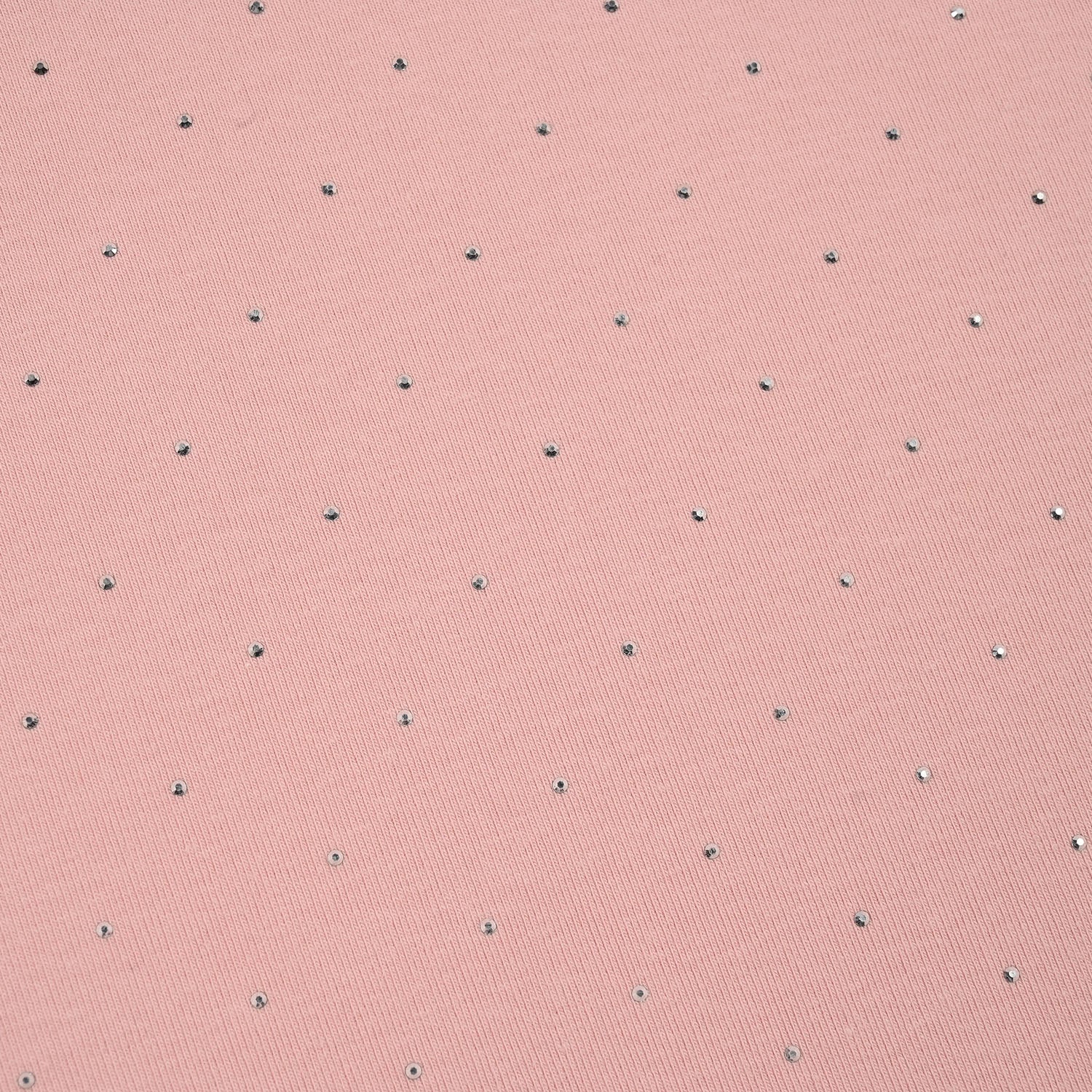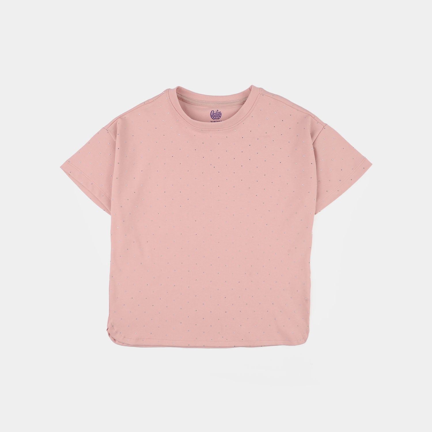This pink jersey/terry T-shirt for girls features a round neck, half sleeves, a rounded hem, and all-over silver stud detailing, perfect for a comfortable and stylish everyday look.
