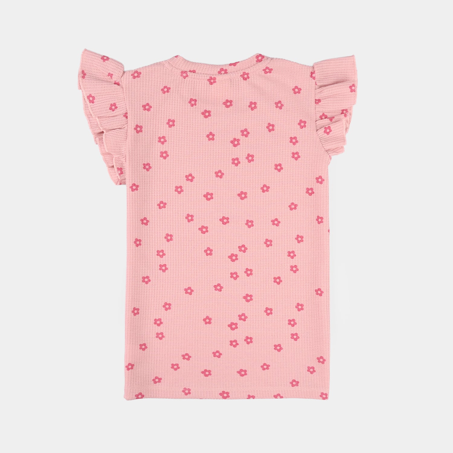 Girls' pink thermal T-shirt featuring soft fabric and flower-themed detailing, perfect for a cozy and comfortable everyday look.
