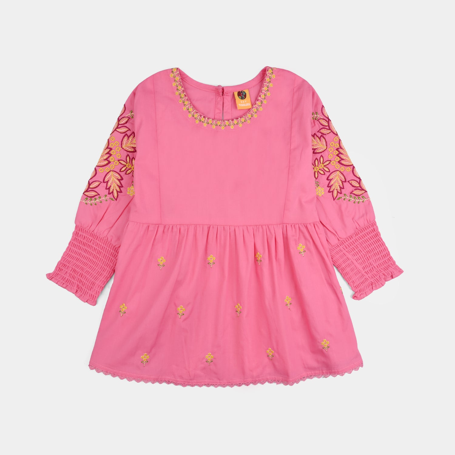 This Girls Jacquard Embroidered Top features premium jacquard fabric adorned with intricate embroidery and smoked sleeves, creating a polished silhouette. The peplum cut ensures a comfortable, flattering fit. Suitable for formal occasions or everyday use, it brings a timeless elegance to your child’s wardrobe.
