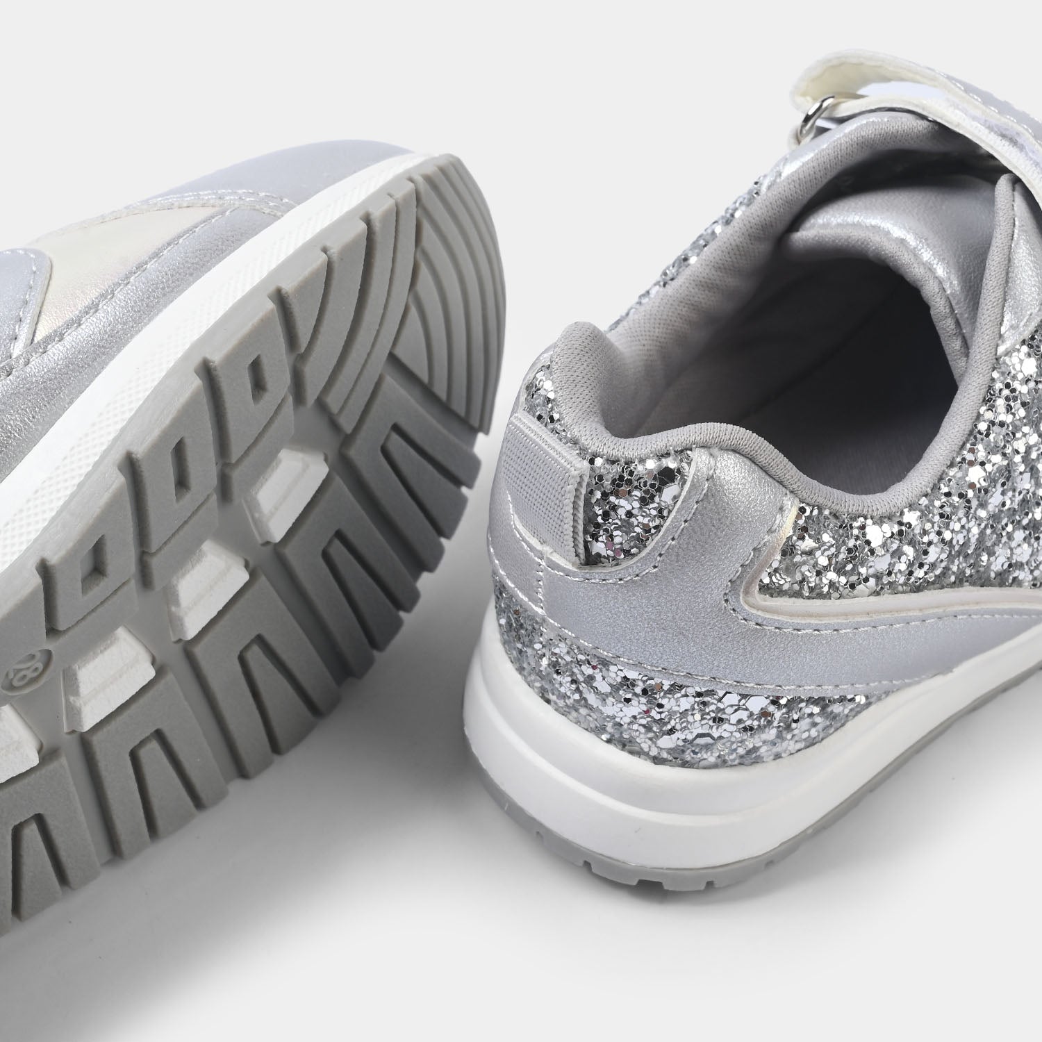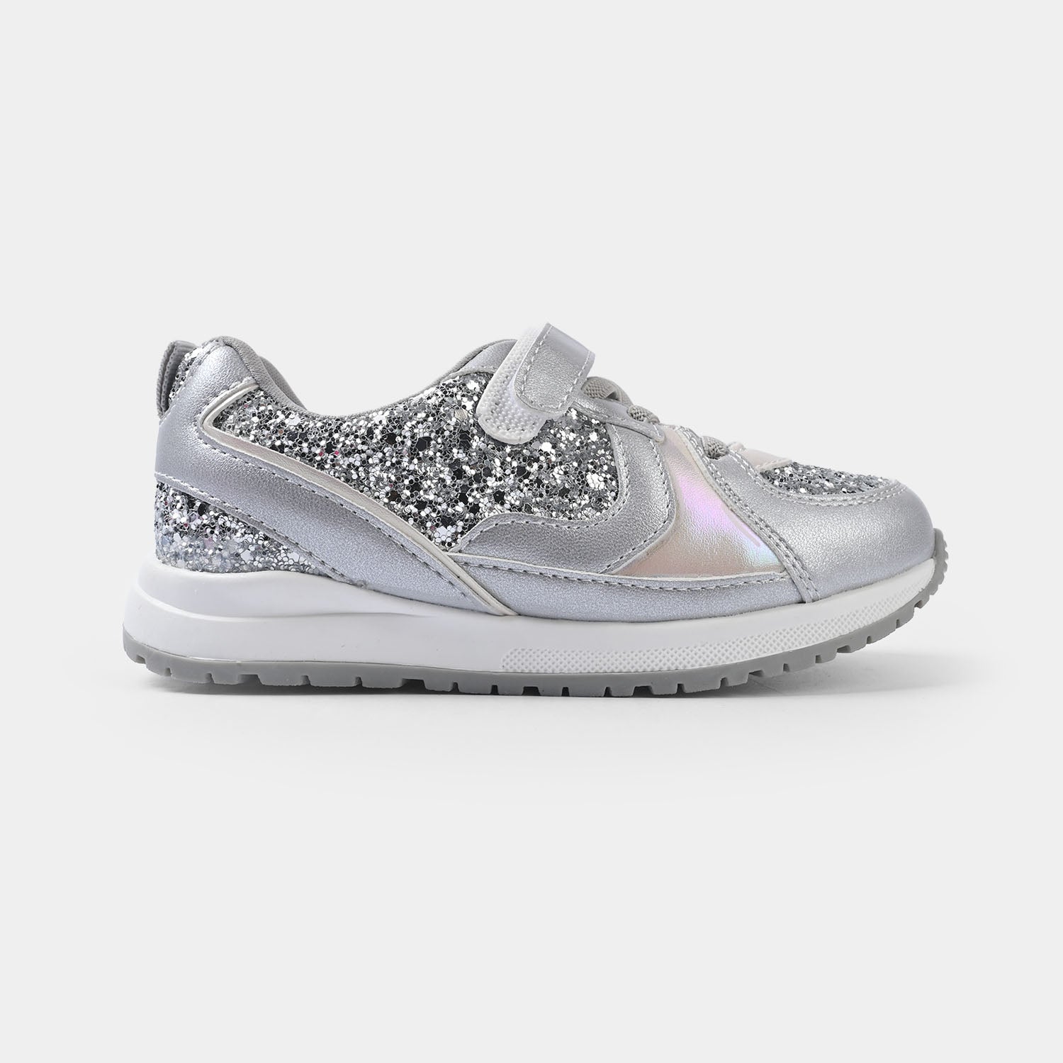 Girls' silver synthetic joggers featuring lace and strap closure and a glittery finish, perfect for stylish party wear and a comfortable everyday look.