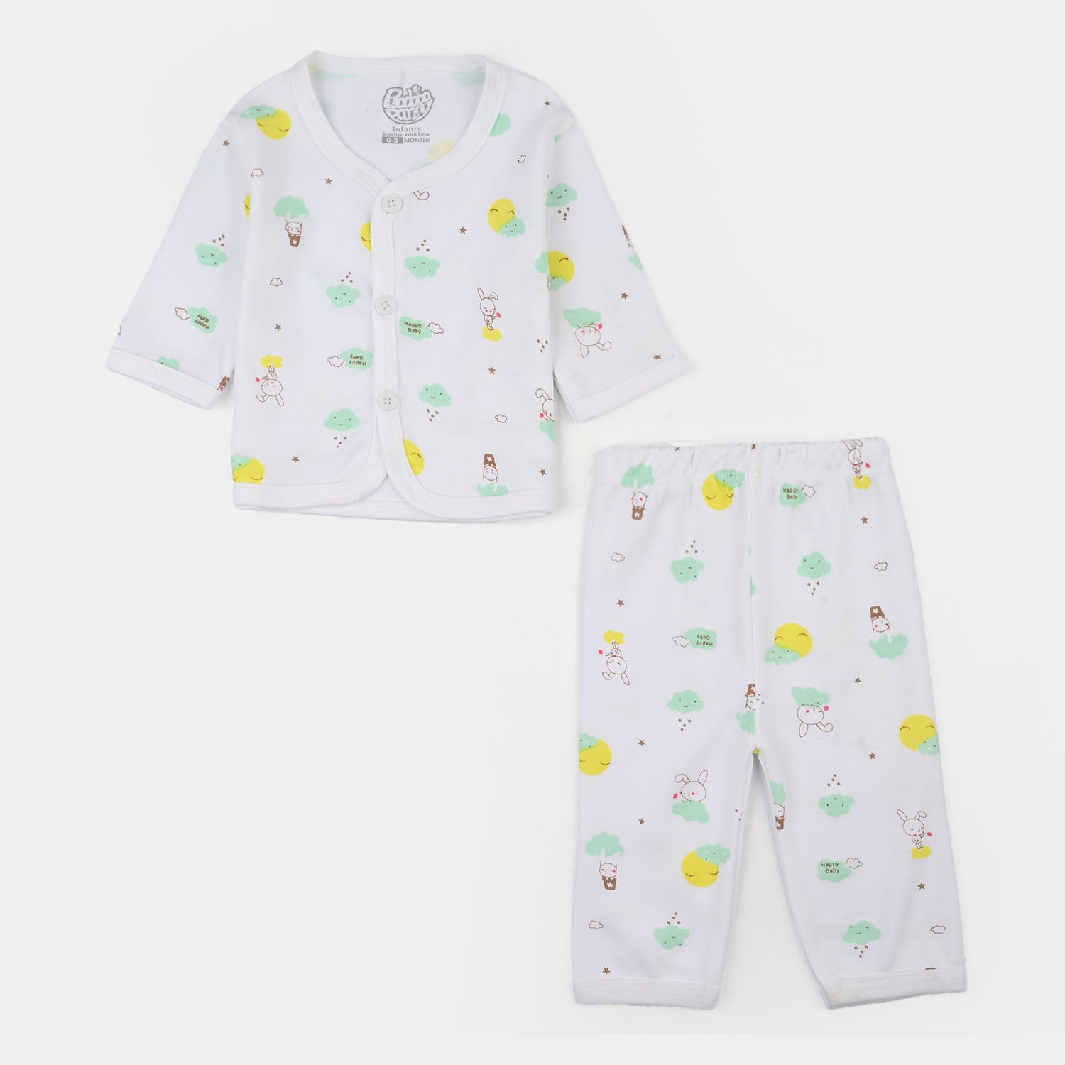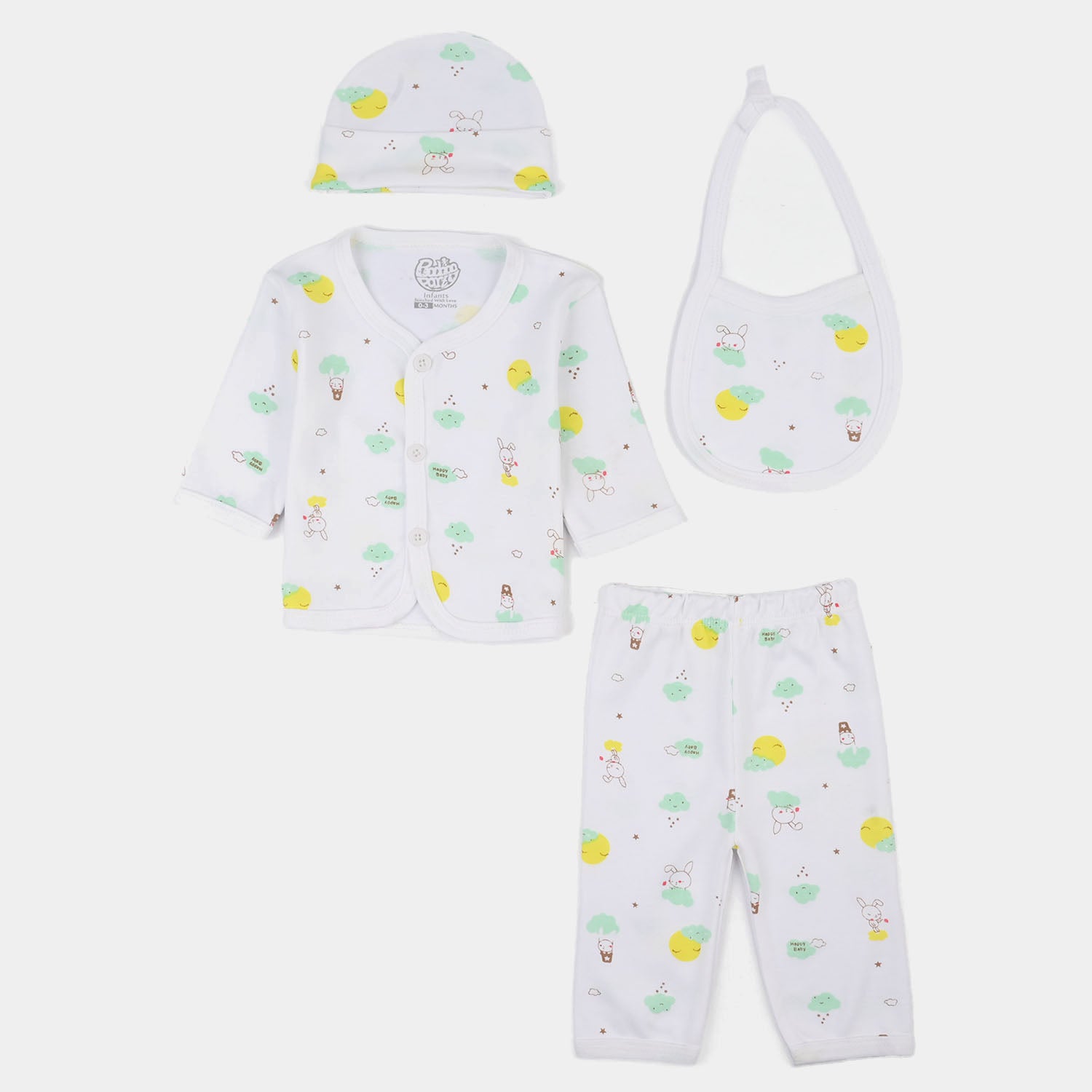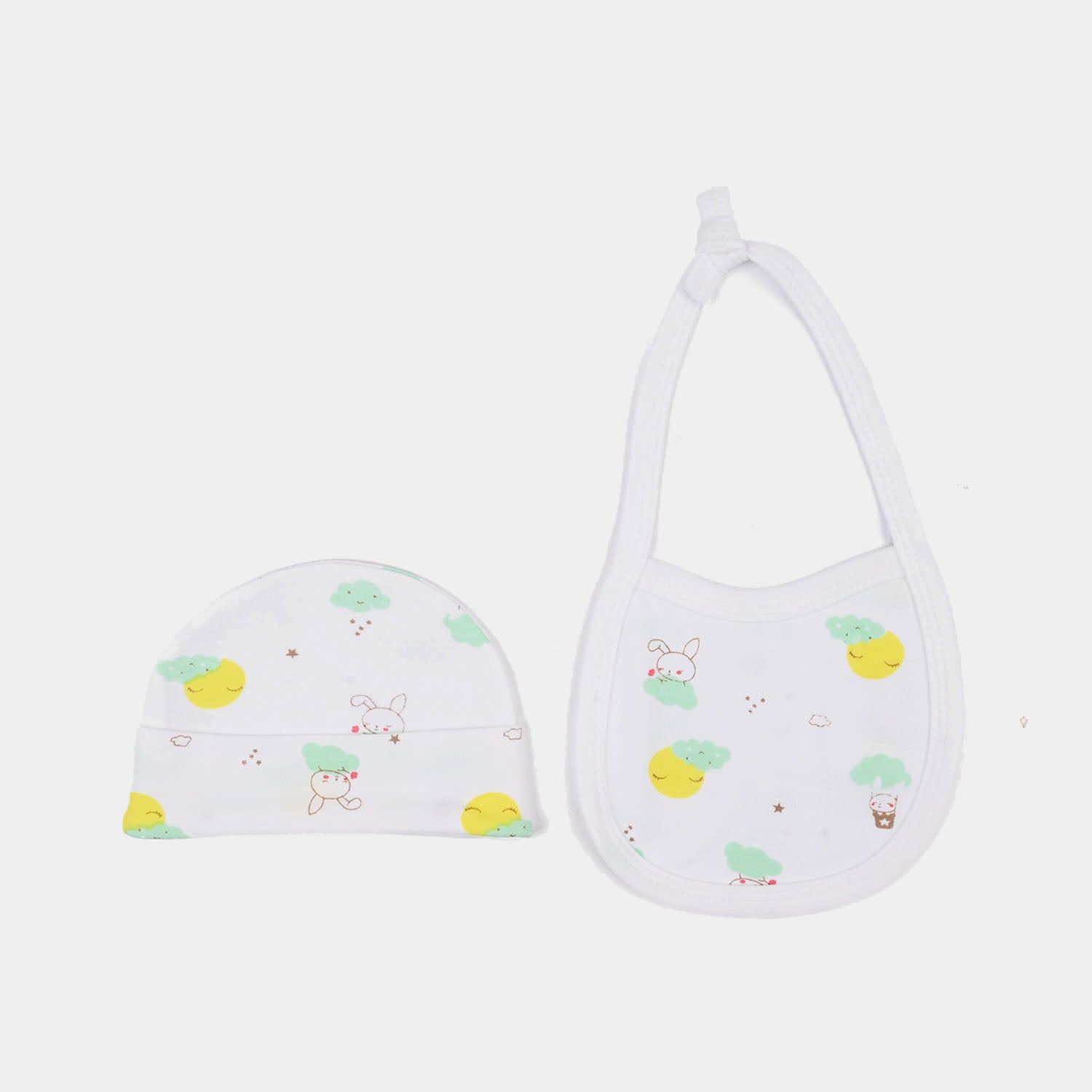 Infant unisex cotton winter suit in white/blue, featuring a night/bunny-themed print and including a shirt, trousers, bib, and matching cap for a cozy, coordinated look.