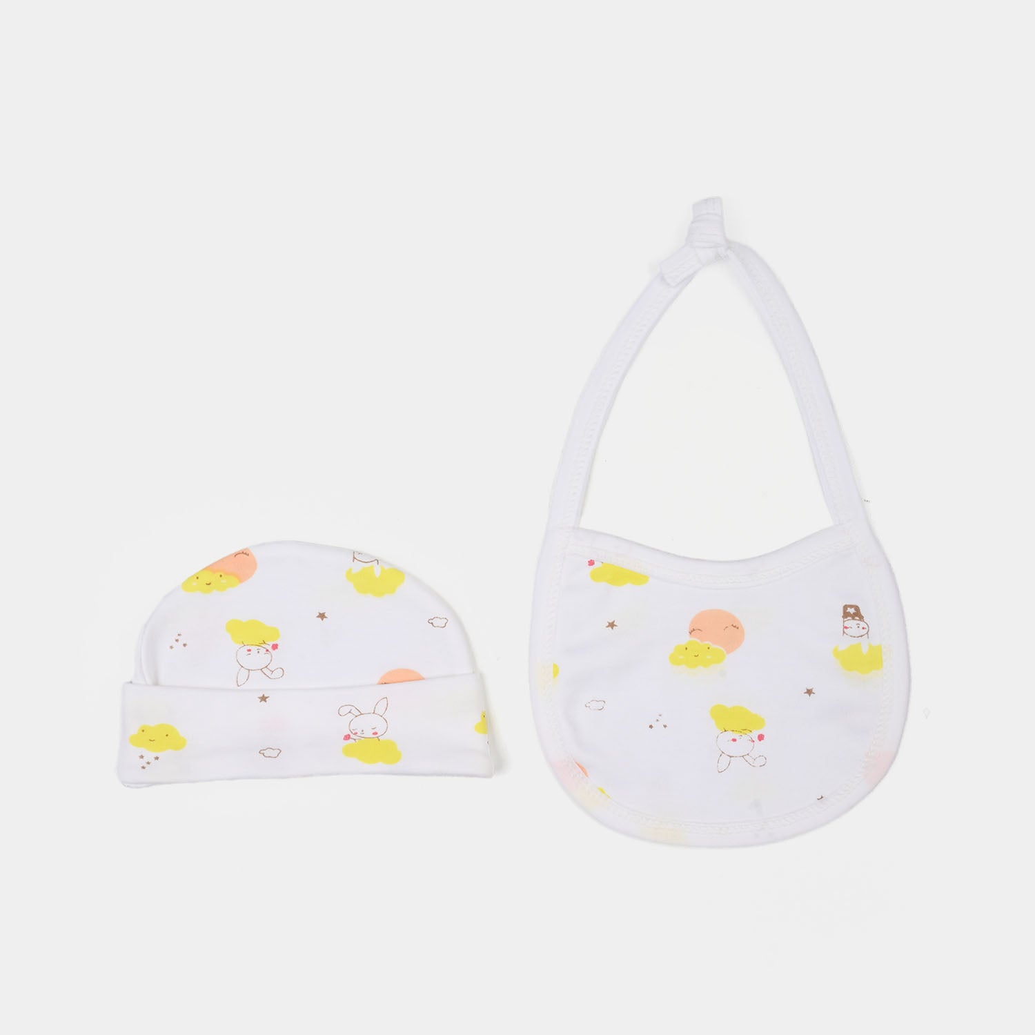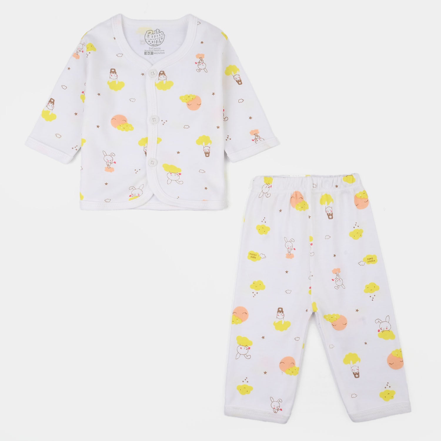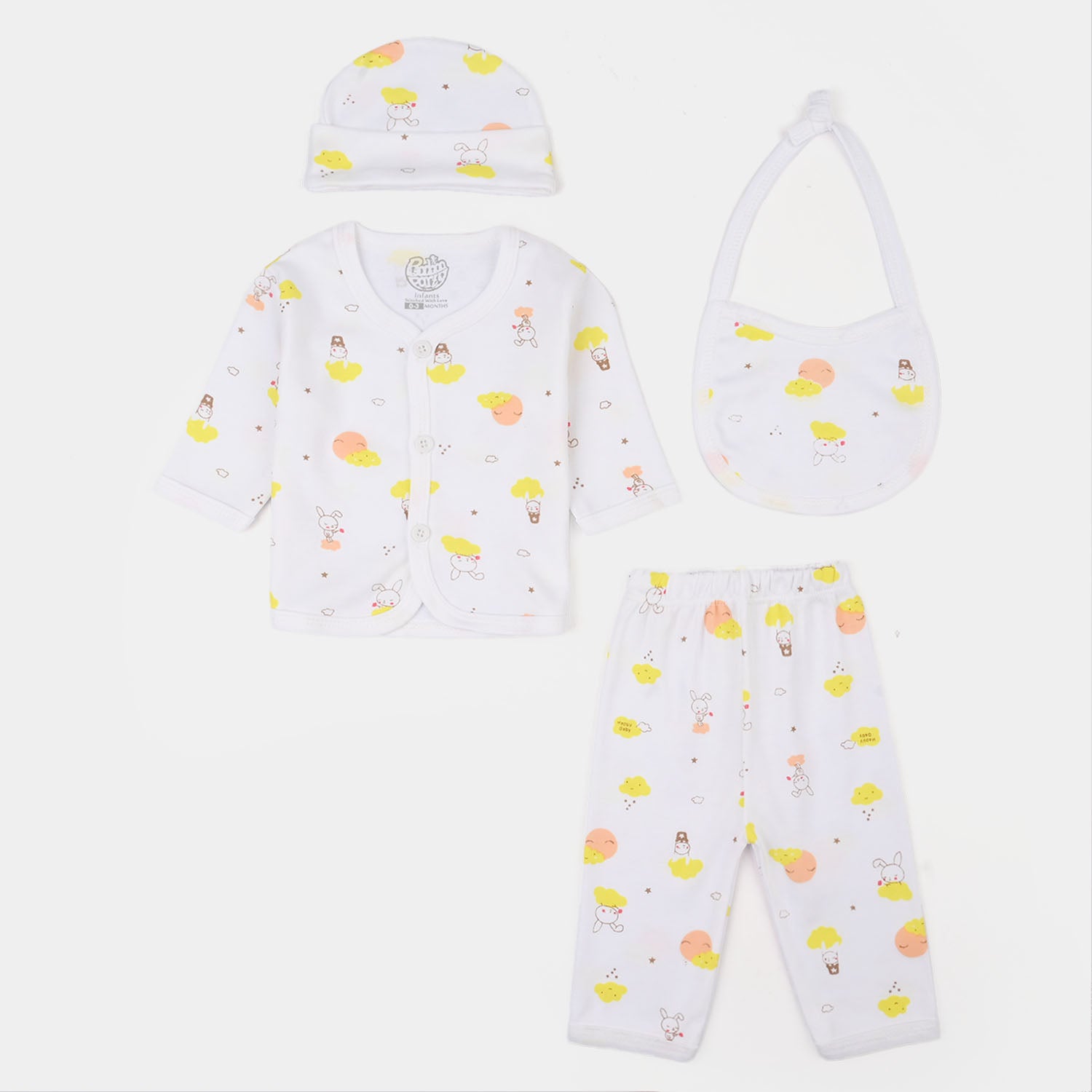 Infant unisex cotton winter suit in white/yellow, featuring a night/bunny-themed print and including a shirt, trousers, bib, and matching cap for a cozy, coordinated look.